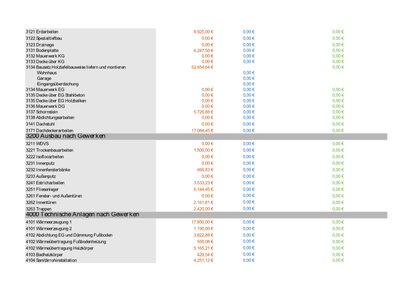 Kostenaufstellung nach Gewerken für Rohbau und Fundament eines Bauprojekts