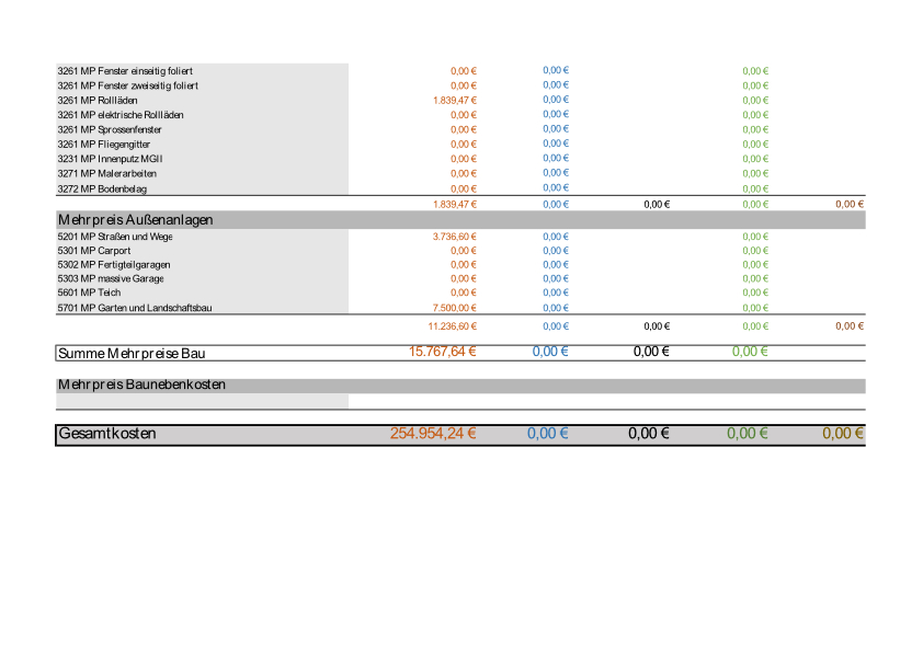 Kostentabelle Mehrpreis Außenanlagen mit Garten- und Landschaftsbau und Kostenübersicht