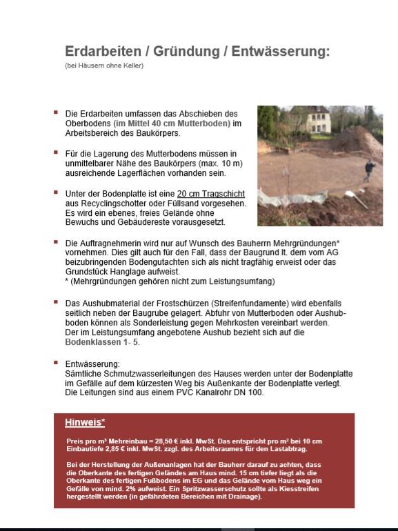 Kennt das Unternehmen dein Grundstück und die aktuelle Situation mit der verteilten, unverdichteten Erde?Ja habe ich alles telefonisch angesprochen. Bilder, Bebauungsplan etc liegt schon vor und pers. Besichtigung des Grundstück durch den Bau-Ing. ist in den kommenden Tagen. Gespräch nächste Woche! Er hat mir im Gegenzug schon einmal die Basic-Bauleistungsbeschreibung zukommen lassen,damit ich mich ebenfalls auf das Gespräch vorbereiten kann.Hier also die Bauleistungsbeschreibung (Teil 1):