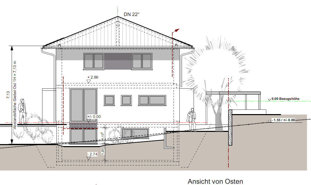 Planung stammt von Architekten. Gewünschtes Raumprogramm wurde umgesetzt, Flur EG jedoch offenbar zu schmal. "Kritischer" Punkt im Planungsprozess war Nordseite des OG, da hier relativ viele Räume und Platz für "T" im Bad benötigt wrd.