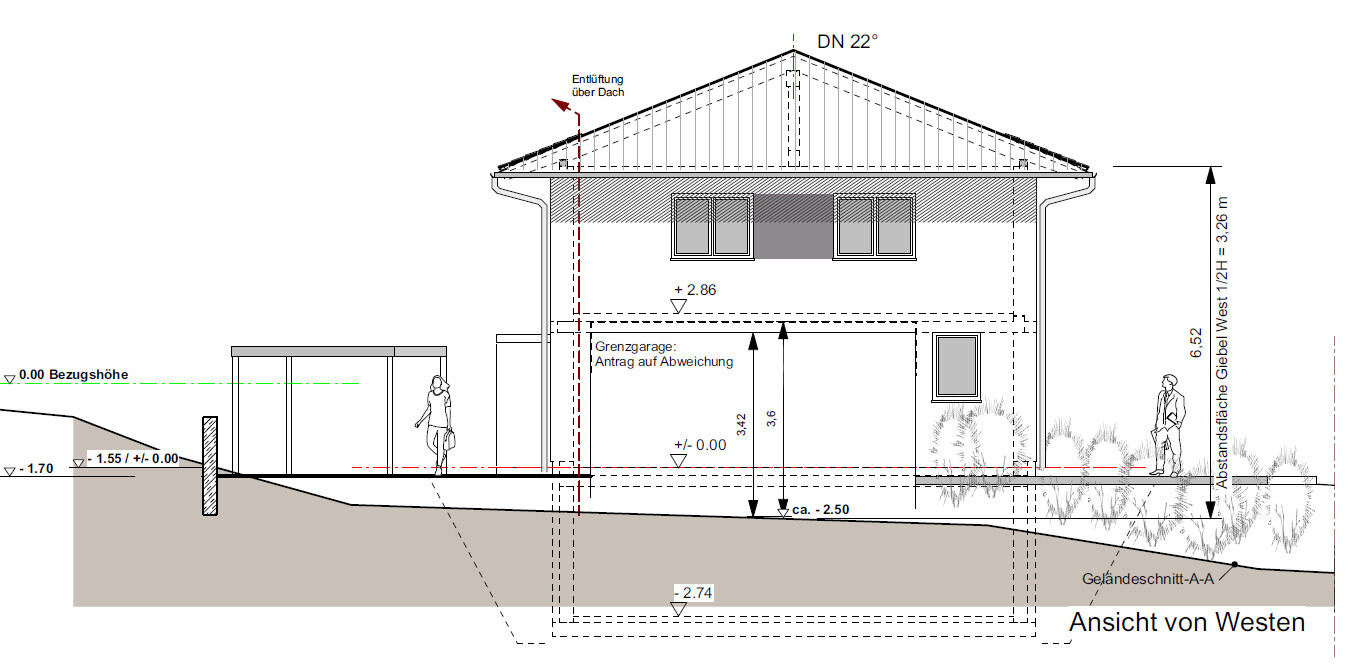 Hinterliegergrundstück mit Gefälle von der Straßenseite (siehe Schnitte). Rudimentärer Bebauungsplan aus den 70ern. Keine Einschränkungen aus Baufenster, Grundflächenzahl, Geschossflächenzahl.