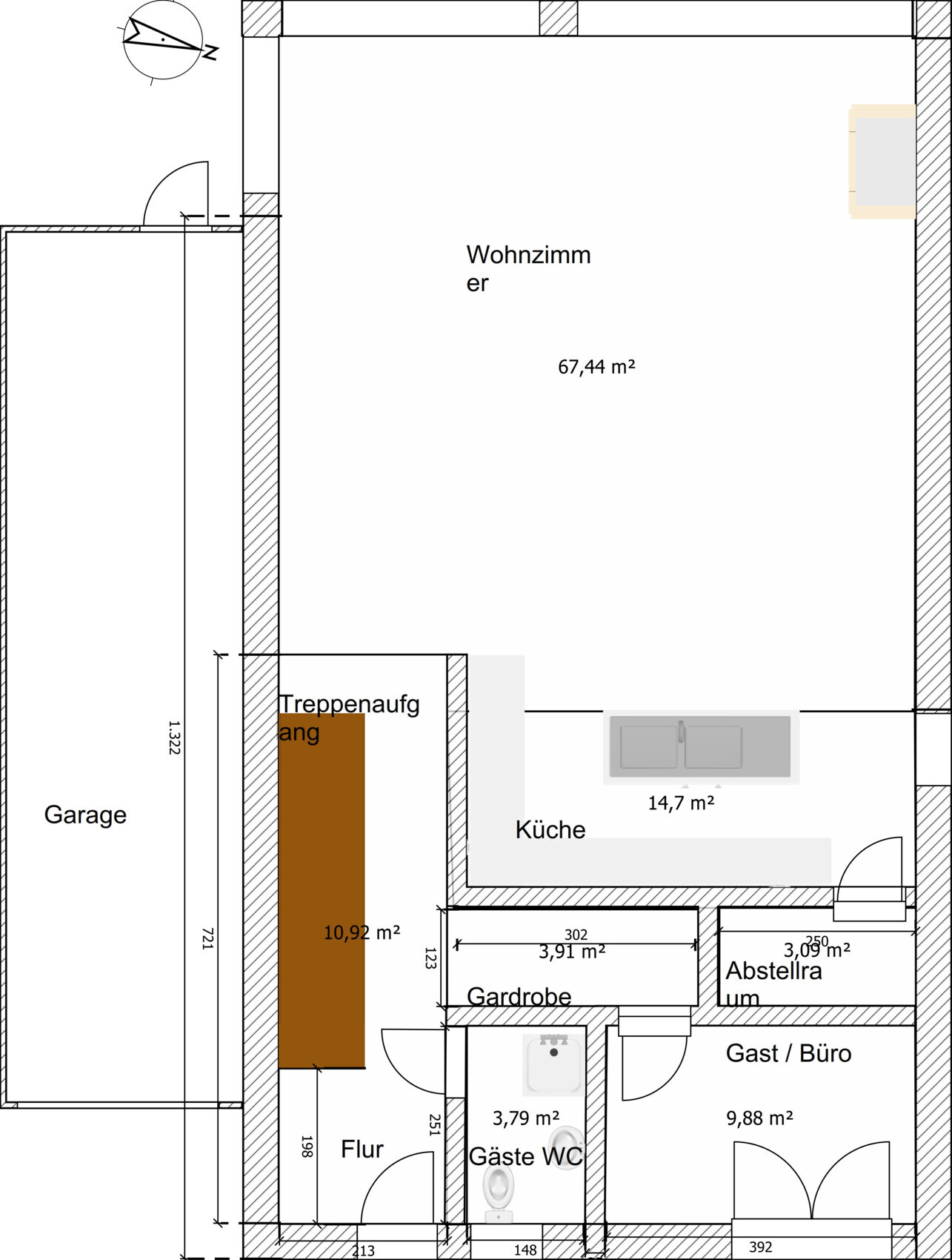 Flurbreite bei 1 m (wie in einem winzigen Reihenhaus) und dann ein Allraum mit über 80 m2, der bei der Möblierung riesige unbenutzte Flächen hinterlässt...ich weiss nicht. Das Problem bei euch ist die Treppe, an dieseer hängt alles.hast du schon mal eine U-Form mit Podest mittig probiert?