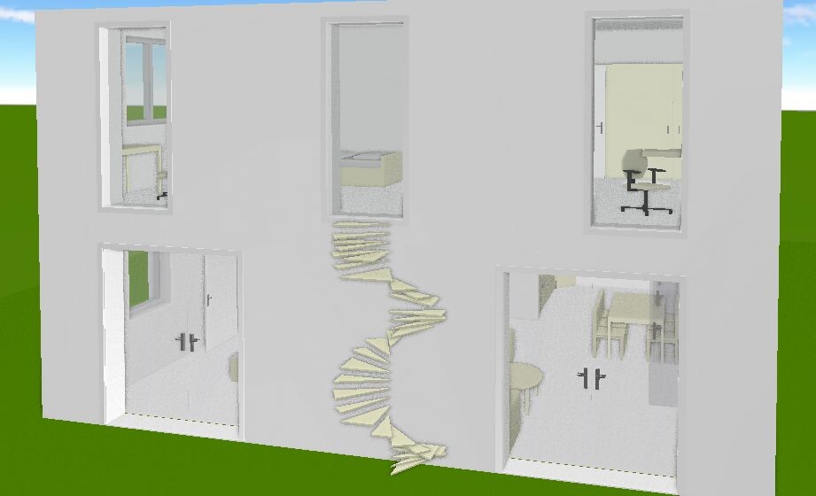Einliegerwohnung: Ich glaube, dass sprengt dann den Rahmen. Aber ich habe noch eine etwas abwegige Idee: Im Kinderzimmer nach Süden hinaus könnte man ein Fenster bodentief machen (kostet nicht viel beim Bauunternehmen), oder gleich alle drei auf der Seite. Draußen würde dann später bei Bedarf einfach eine Wendeltreppe angebaut werden. Als kleine Erheiterung habe ich dafür ein Bild beigefügt.