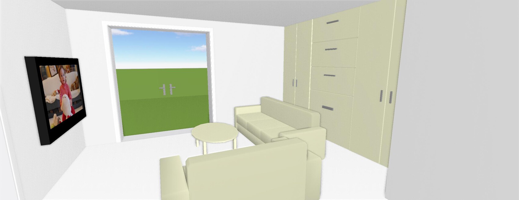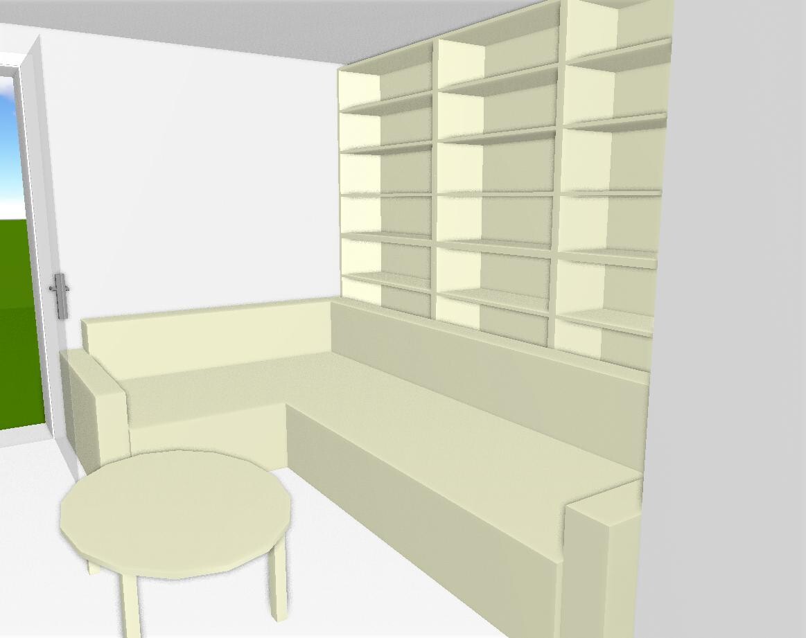 Wohnzimmer: Ich habe überlegt, ob man in die Nische noch etwas stellen könnte. Anbei sind zwei Beispiele (nur zu Verdeutlichung, die Objekte im Programm sind recht einfach), einer mit und einer ohne kleinen Gang dazwischen. So hätte man jede Menge Stauraum (3,70 m lange Wand) und würde auch näher am Fernseher sitzen. Oder ist das alles zu unpraktisch? Ich finde solche großen Wohnlandschaften zum Lümmeln gut.