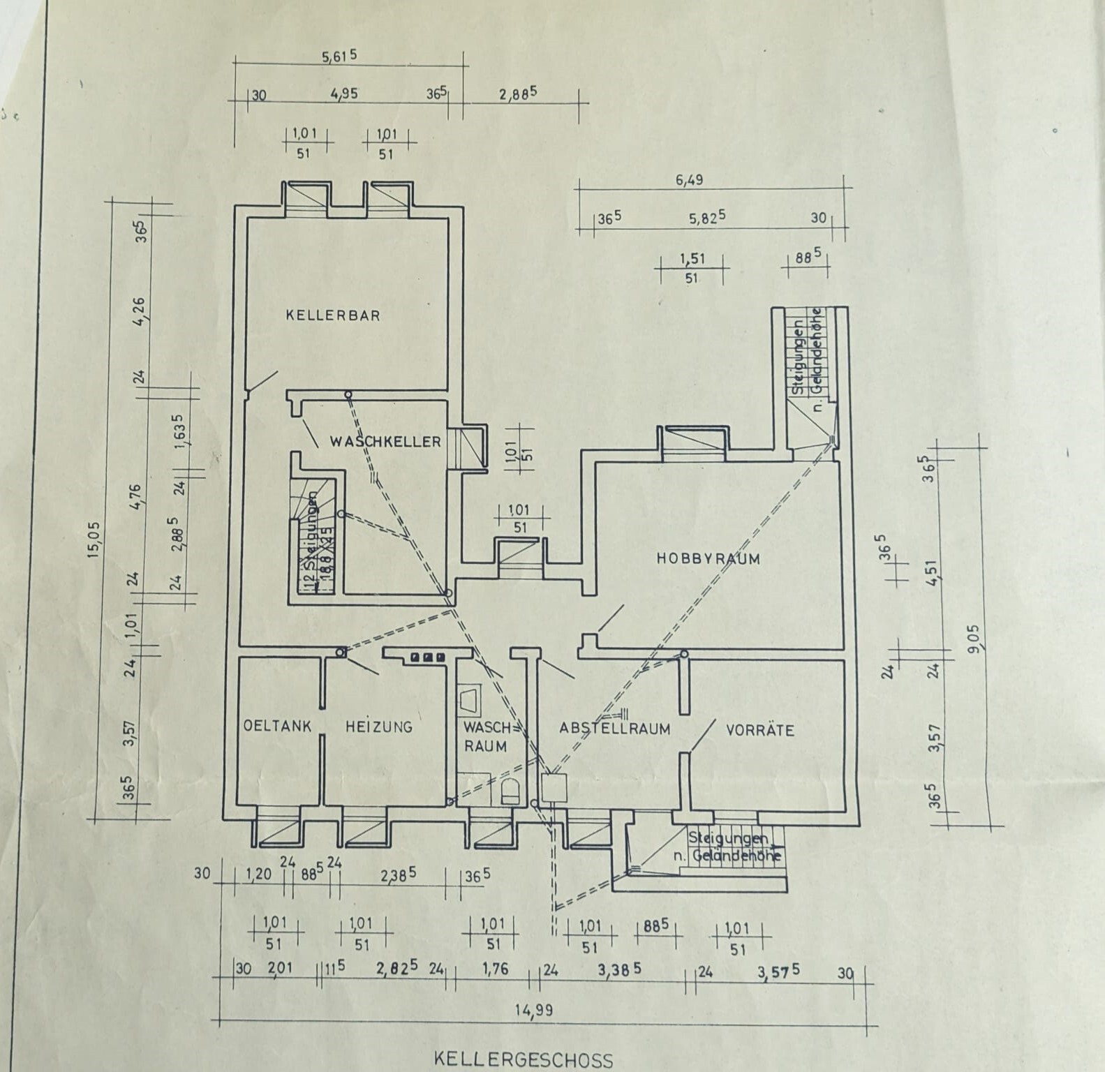 Meine Eigenzeichnung basiert auf dem Ursprungsplan, den ich hier ebenfalls hochgeladen habe. Das Gebäude wurde damals größtenteils in Eigenleistung gebaut. Dementsprechend habe ich die Räume nochmals vermessen, um zu erkennen, ob irgendwo vom ursprünglichen Plan abgewichen worden ist. Die mit der Zeit erfolgten Umbauten habe ich ebenfalls vermessen, da hierzu keine Zeichnungen existieren. Diese drei "Grundlagen" habe ich in meiner Eigenzeichnung berücksichtigt, so wie ich das in meinem gestrigen Beitrag beschrieben habe.