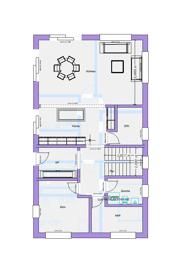 Wie gesagt, Speisekammer verkürzen und WZ noch tiefer wäre auch drin. Dann müsste man den Statiker allerdings mal fragen, ob der Unterzug bei der Küche ausreicht, die restlichen 5m Tiefe und 9m Breite zu überbrücken. Schließlich kommt ja noch ein Stockwerk drüber und ein Dach.