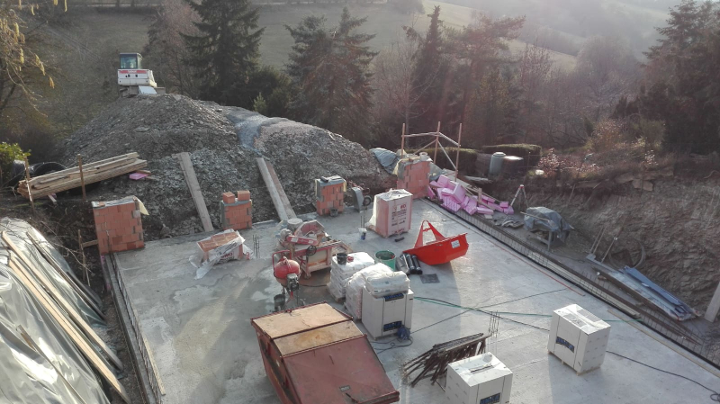 Die Verputzer haben mir extra eine mobile Treppe reingebaut, sonst hätte ich nicht zur Estrichtrocknung Lüften können. Ich komme nicht per Leiter in einen anderen Stock.