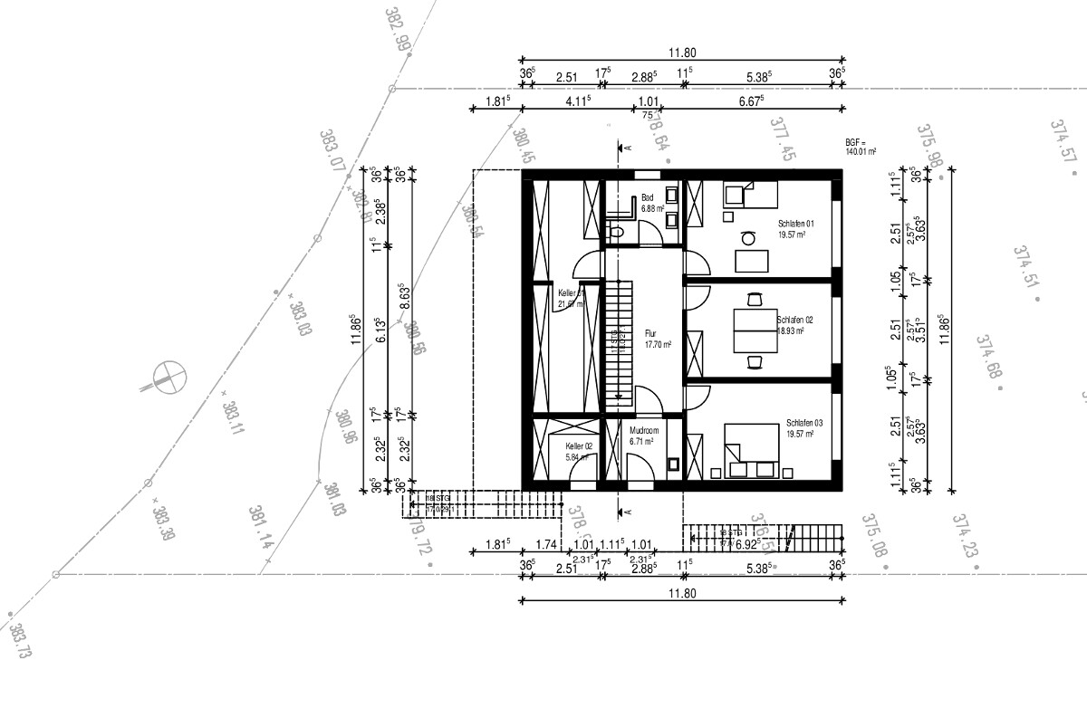 ... Zeit vergeht ... Die Thematik Finanzierung war doch etwas zeitaufwendiger als gedacht. Zwar ist noch nichts unterschrieben, aber der Abschluss naht . Folgend mal die Grundrisse, Ansichten und der Schnitt zur Diskussion. Die Möblierung ist noch nicht angepasst, bspw. ist er Kopfteil vom Bett im EG an der Nordwand. Auch der Erker wird im EG vermutlich nicht so kommen. Entweder wird es keinen geben, oder er wird gänzlich Richtung Süden gezogen, damit ein Grundriss. Esstisch dort untergebracht werden kann.