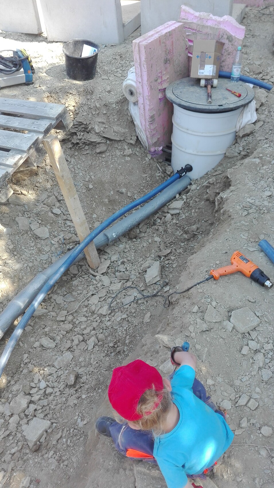 Die Anschlüsse aus dem Keller (Wärmepumpe) an den Geothermieverteiler haben wir verschweißt. Als nächstes müssen die vier einzelnen Kreisläufe (je 300m) gelegt werden und anschließend verschweißt.