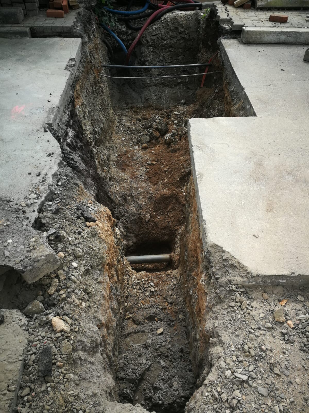Hausanschluss Mehrsparte findet nun auch im öffentlichen Bereich statt. Das Wasser liegt auf jeden Fall frostfrei . 3m unterm Asphalt. Das kommt halt davon, wenn die Straße nachträglich angehoben wird.