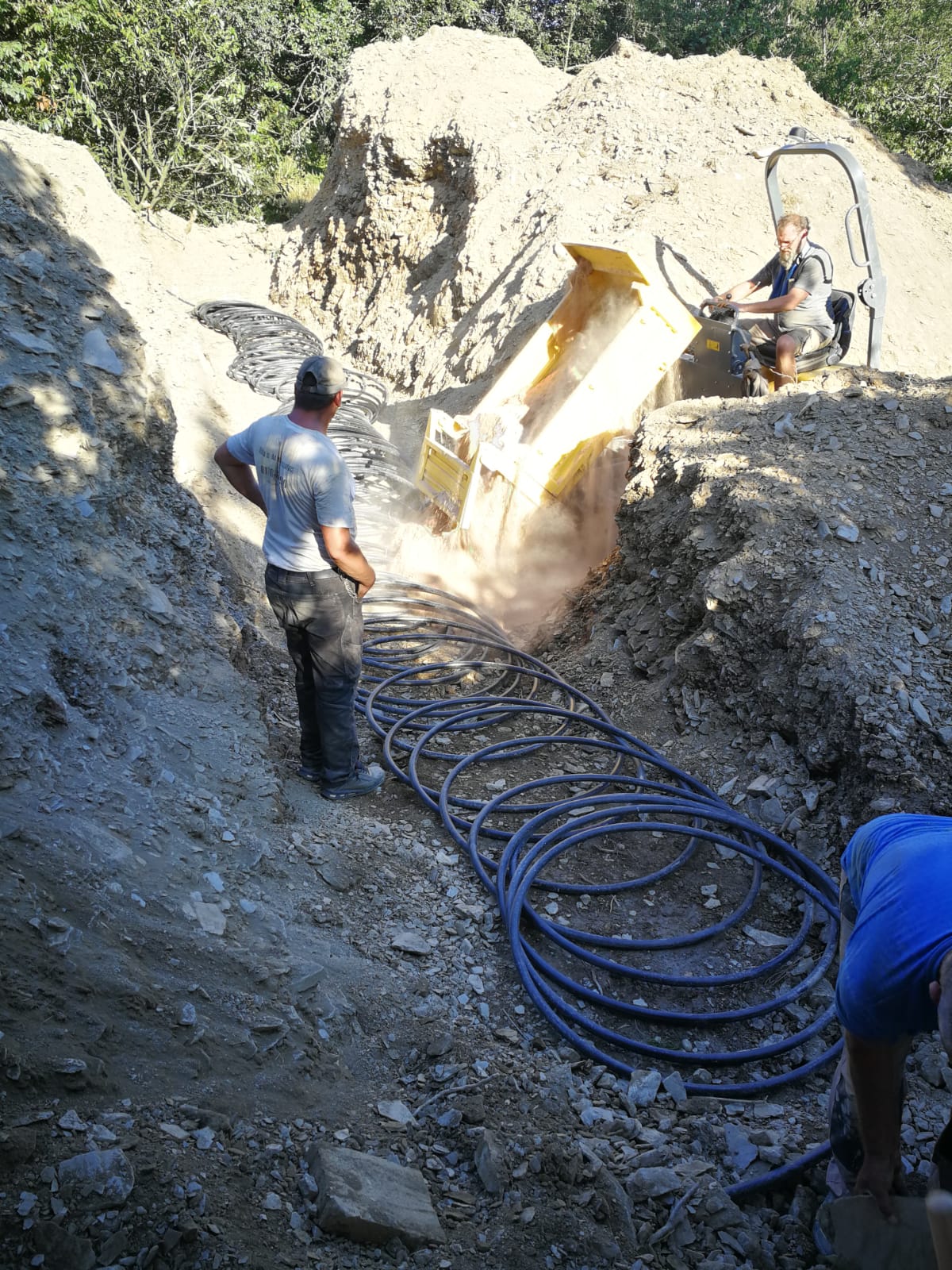Die vier Erdkollektoren mit jeweils 300m wurden auch verbuddelt und am Verteiler angeschlossen. Somit wird nun so gut wie keine Erde mehr im Garten bewegt. Es war schon lästig, da man immer nur einen Graben für den Kollektor ausheben konnte und quasi auf dem nächsten den Aushub abgelegt hat. Parallel konnten die Gräben nicht geöffnet werden. Somit wurde jeder Haufen mindestens fünfmal bewegt.