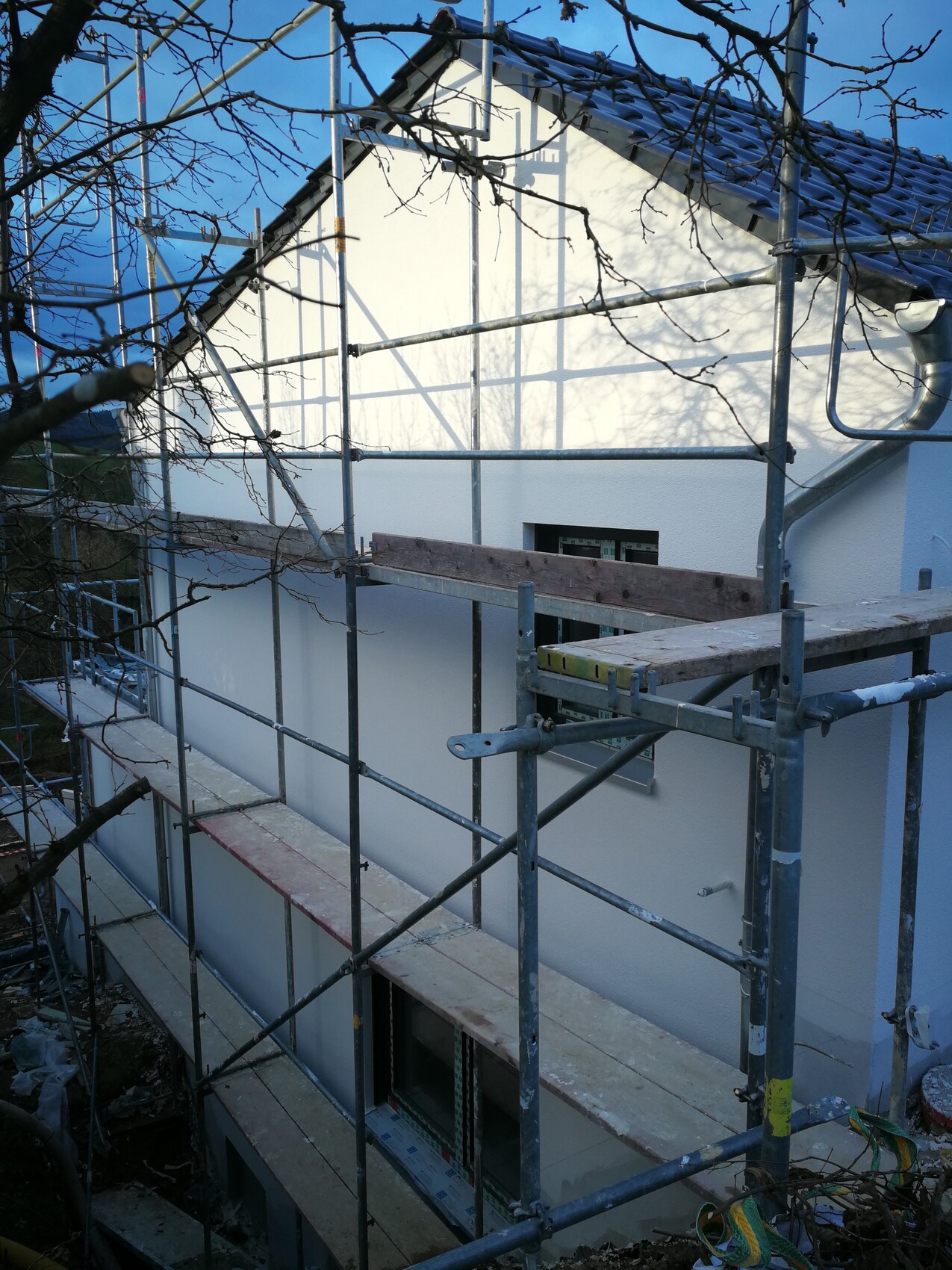 Außenputz. Ganz am Anfang habe ich immer gesagt, ich will kein weißes Haus mit grauen Fenstern und grauem Dach… Naja, die Bilder könnt ihr ja im Anhang sehen. Wir hatten uns eigentlich auf einen grau-braun Ton für das Haus geeinigt, aber die Gründe dagegen waren zum einen die Kosten. Der Anstrich erfolgte zweimalig und dies sollte für die nächsten Jahre gar Jahrzehnte ein ordentliches, sauberes Erscheinungsbild gewähren.