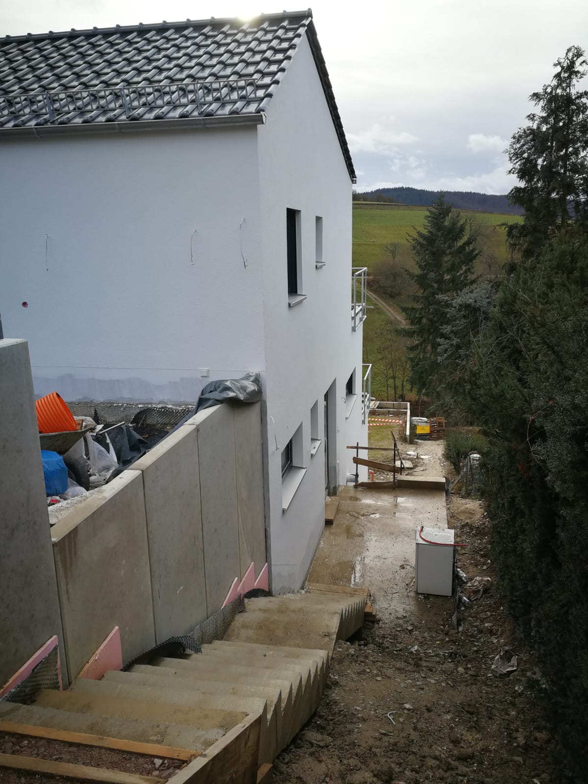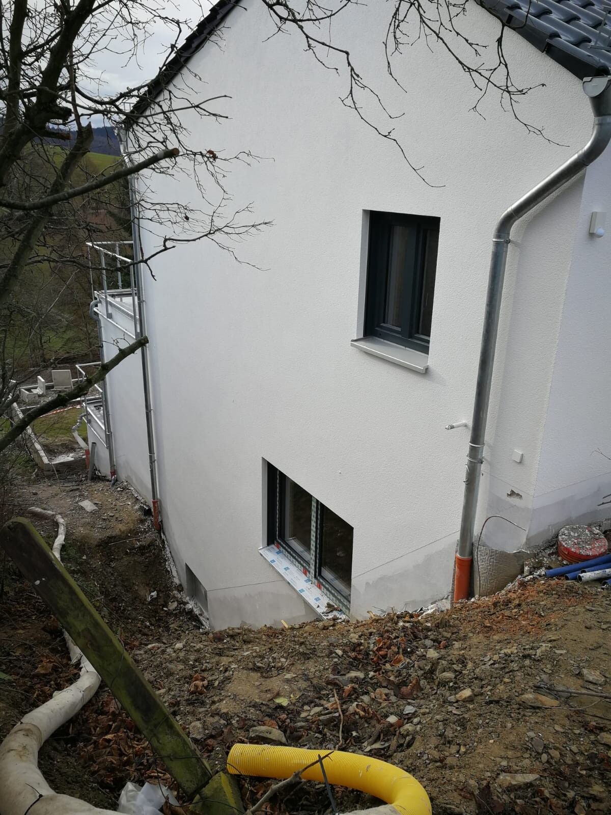 Anbei ein paar Bilder ohne Gerüst. Dank Klimawandel war das Säen Ende Oktober auf immerhin 450 Höhenmeter erfolgreich. Das Wasser das durch die Leerrohre zeitverzögert in die Bude tropft kommt wahrscheinlich durch ein oder mehrere Undichtigkeiten in der Abdichtung des Flachdachs bei der Terrasse. Das hatten wir in unserer vorherigen Mietwohnung leider auch. So wurde bei uns zwei Mal das Parkett in der Neubauwohnung ruiniert. Das Wasser hat sich dort angesammelt bis es den Weg durch ein Mini Loch gefunden hat und durch das Leerrohr in unsere Wohnung gelaufen ist. Das Ende vom Lied war, dass der GÜ der das in Gewährleistung beheben musste mehr als 1 Monat rumgemacht hat. letztlich wurde die Leckage nur gefunden in dem Rauch durch alle Öffnungen eingeblasen wurde und die obere 80 qm ² Flachdachterrasse wieder komplett abgedeckt gewesen war. Sind eure Terrassen schon belegt?