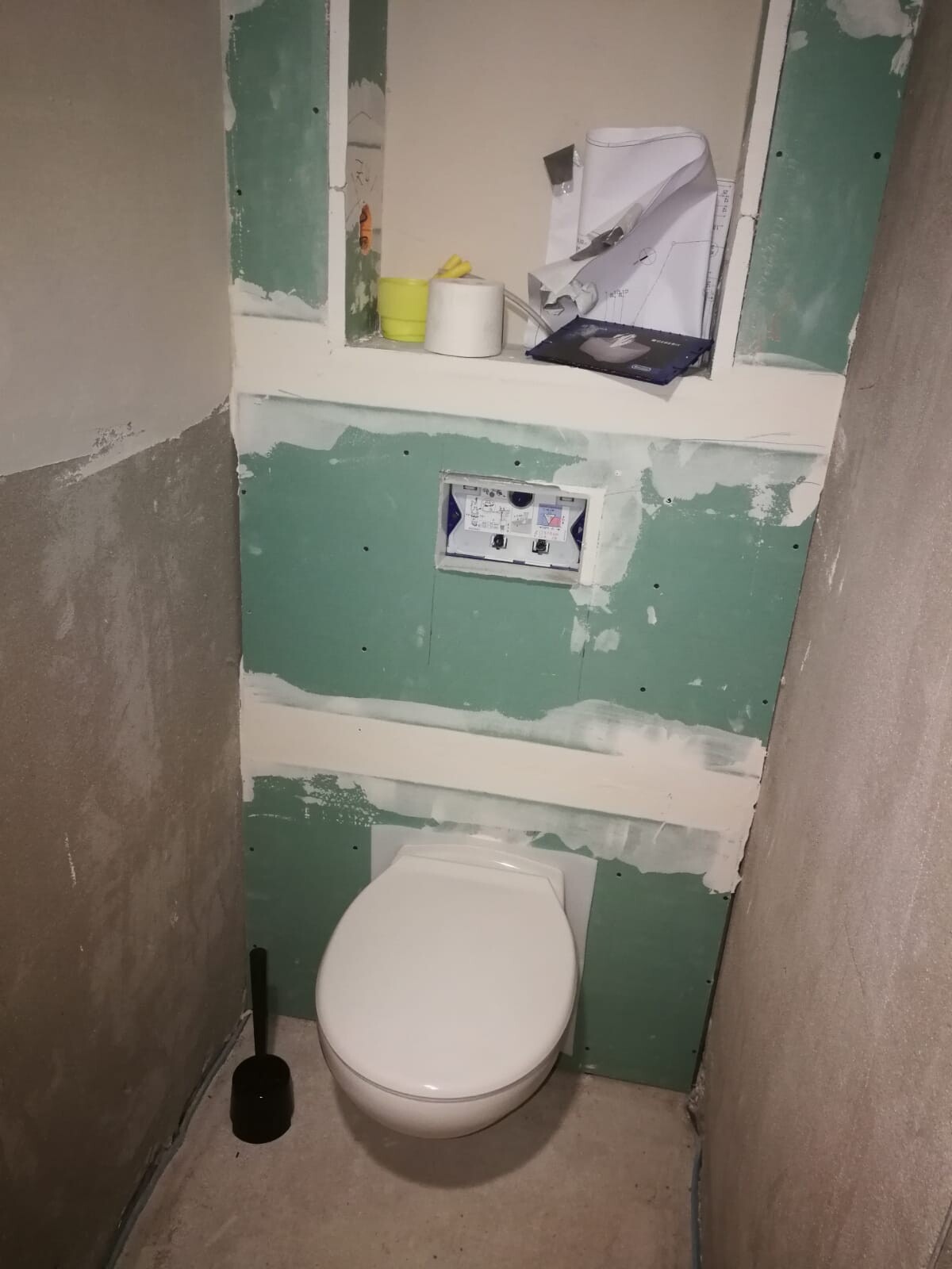 Seit dem 06.01.2020 werden nun auch die Bäder gefliest. Teilweise wird im Haus geschnitten. Aber selbst mit abgehängten Türen, das kennt jeder, zieht der Staub überall hin, selbst in die letzte Ritze.