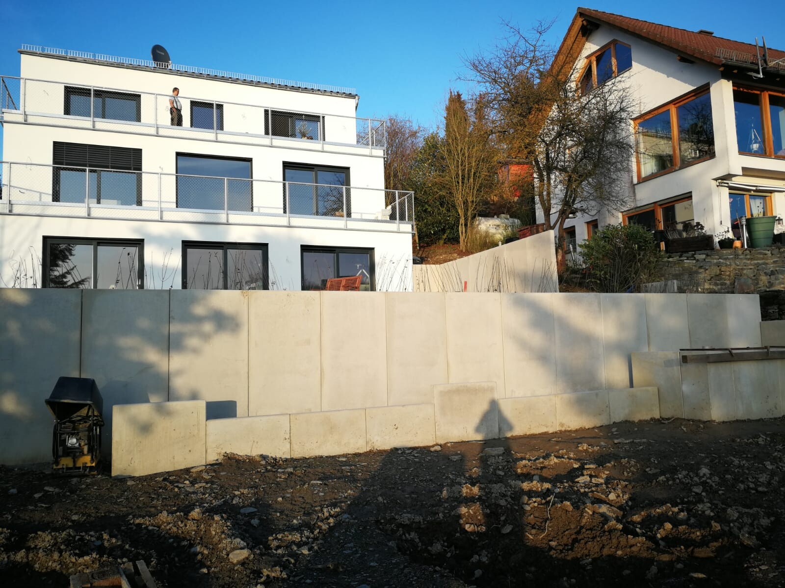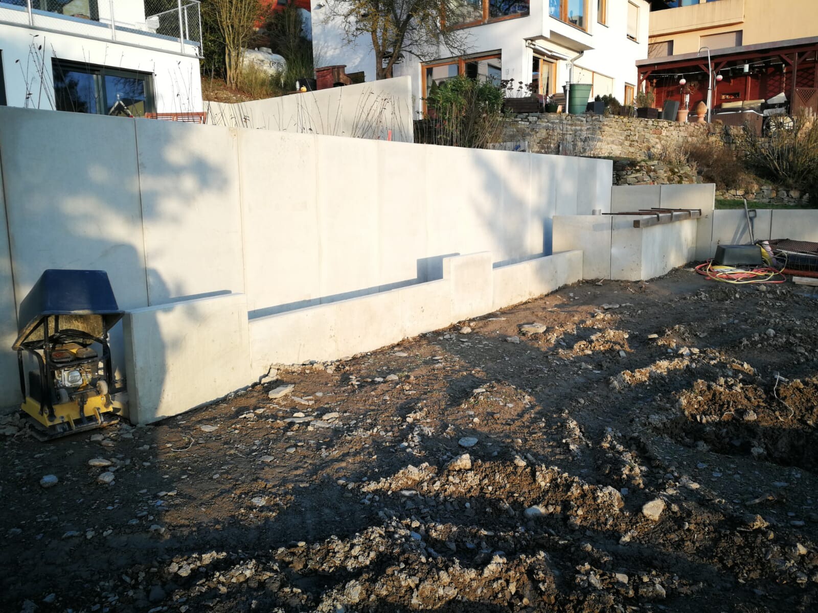 Wir haben uns mal wieder mit L-Steinen vergnügt. So langsam bin ich mit dem Bagger recht sicher und mir vertrauen auch die Helfer . Auf die flacheren Bereiche sollen Holzlatten zum Sitzen und Liegen und in die höheren dann etwas Begrünung. Mal schauen wie es wird.