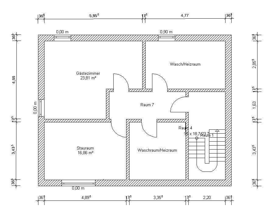 Da sind keine Wände übereinander (außer die 3,43 er Mittelwand), Fenster in der Front sind sieben mit verflixten 7 verschiedenen Formen, 9qm Speis und Gäste-WC ähnlicher Größe, stattdessen einen Wohnraum im Keller… und 36,5 Wände: hat man die noch? Fenster sind auch völlig willkürlich gesetzt und gehen keine Verbindung mit dem anderen Geschoss ein.