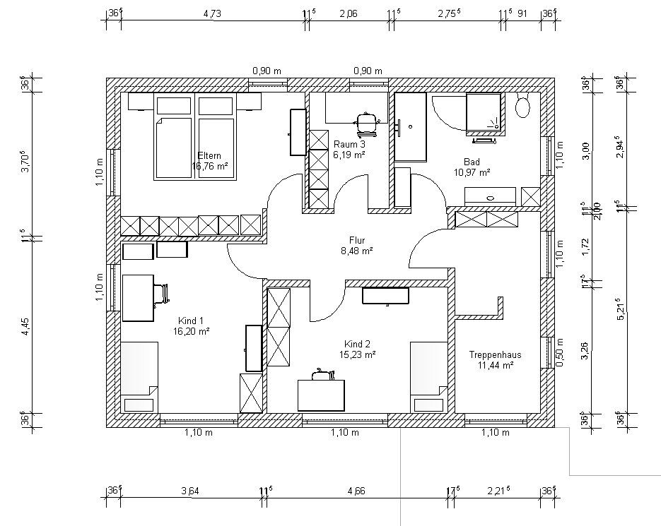 Grundriss eines Hauses mit Flur, Bad, Eltern- und Kinderzimmern, Treppenhaus