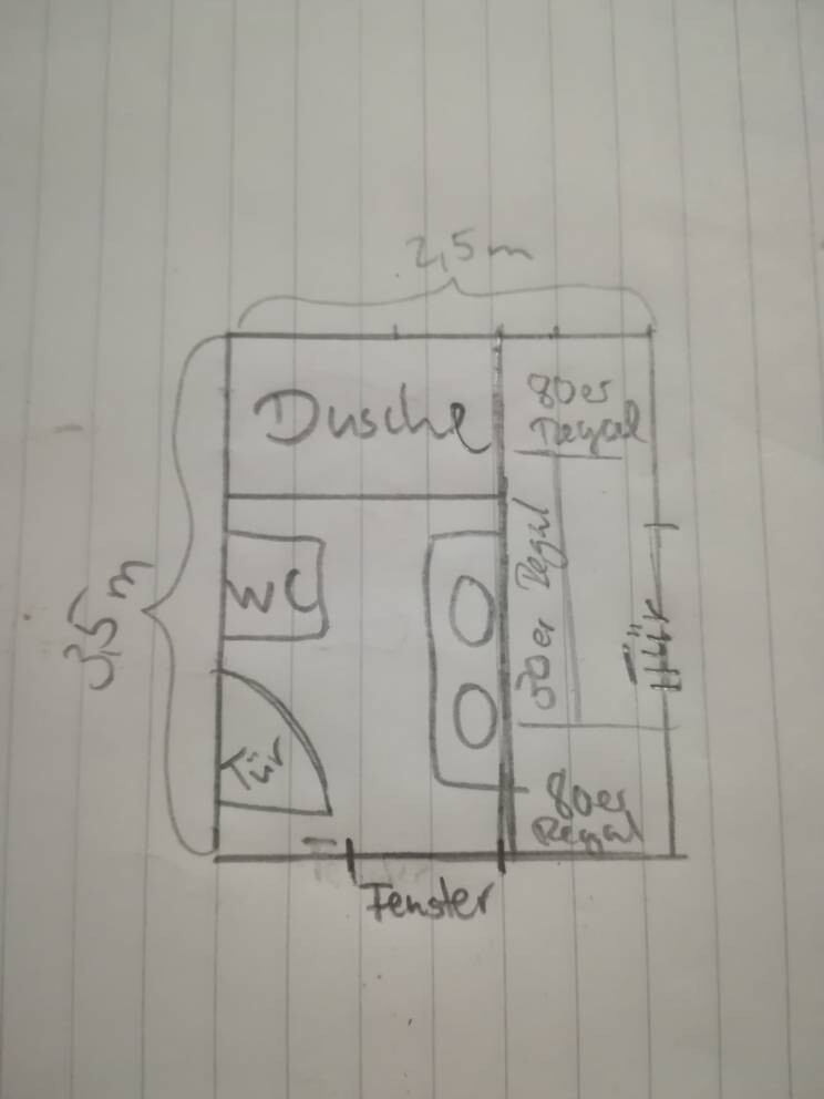 Skizze eines Badezimmer-Grundrisses mit Dusche, WC, Fenster, Regal rechts, Tür links