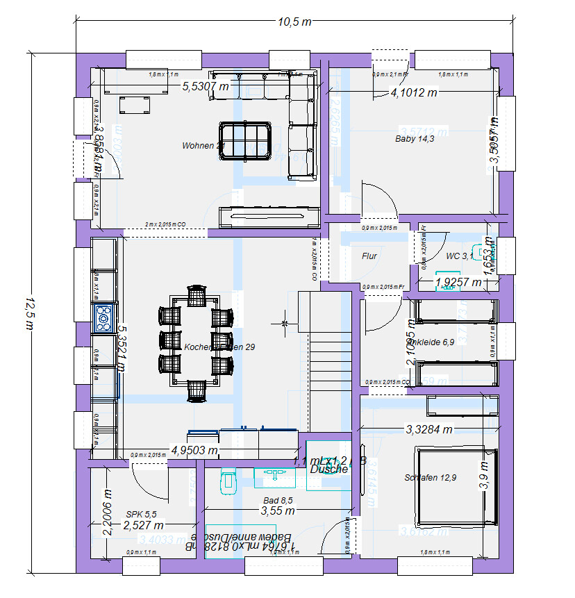 ... jetzt hast du das Haus aber noch verkleinert - oder? Esstisch ist 220 cm lang, Klavier muss untergebracht werden. Leider fehlen mir ein paar Maßangaben in der Zeichnung.