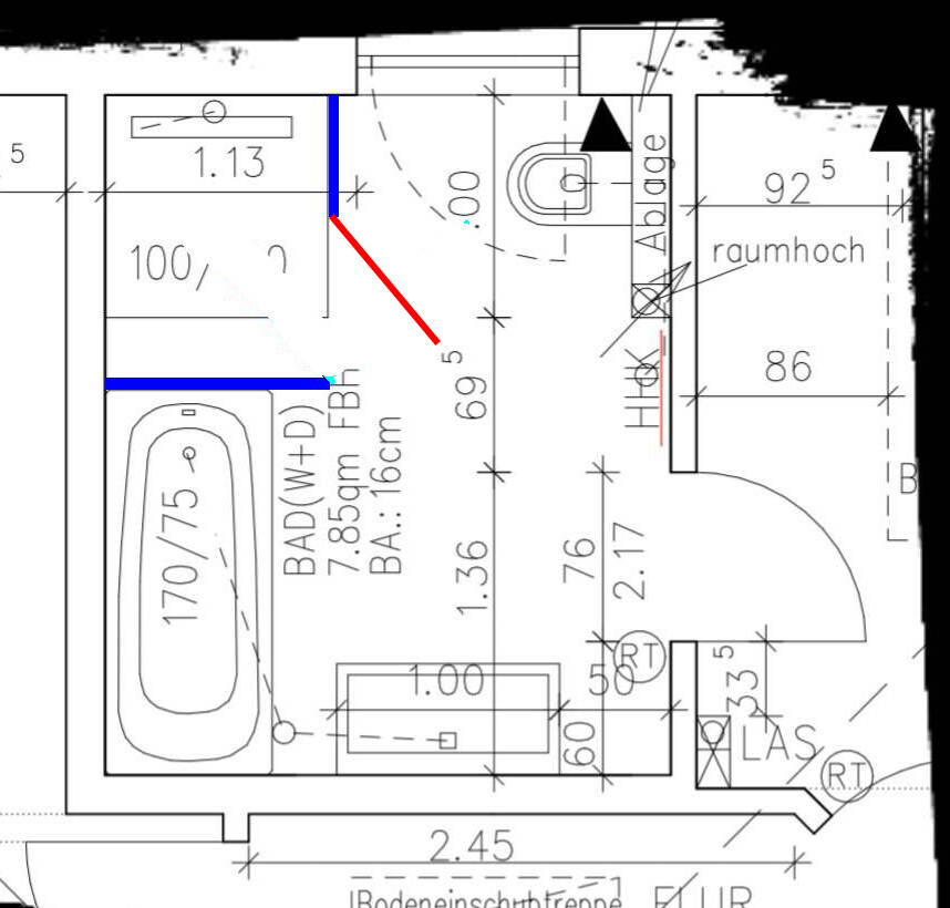 Wenn die Tür nach innen pendelt, ist sie immer im Weg, wenn Du mich fragst.Hängt von der Länge des senkrechten Stück Festglases ab. Deshalb hatte ich ja geschrieben "auf jeden Fall Pendeltür, evtl. als Faltpendeltür" und das geht super nach innen.Aufsicht von meinem Bad: