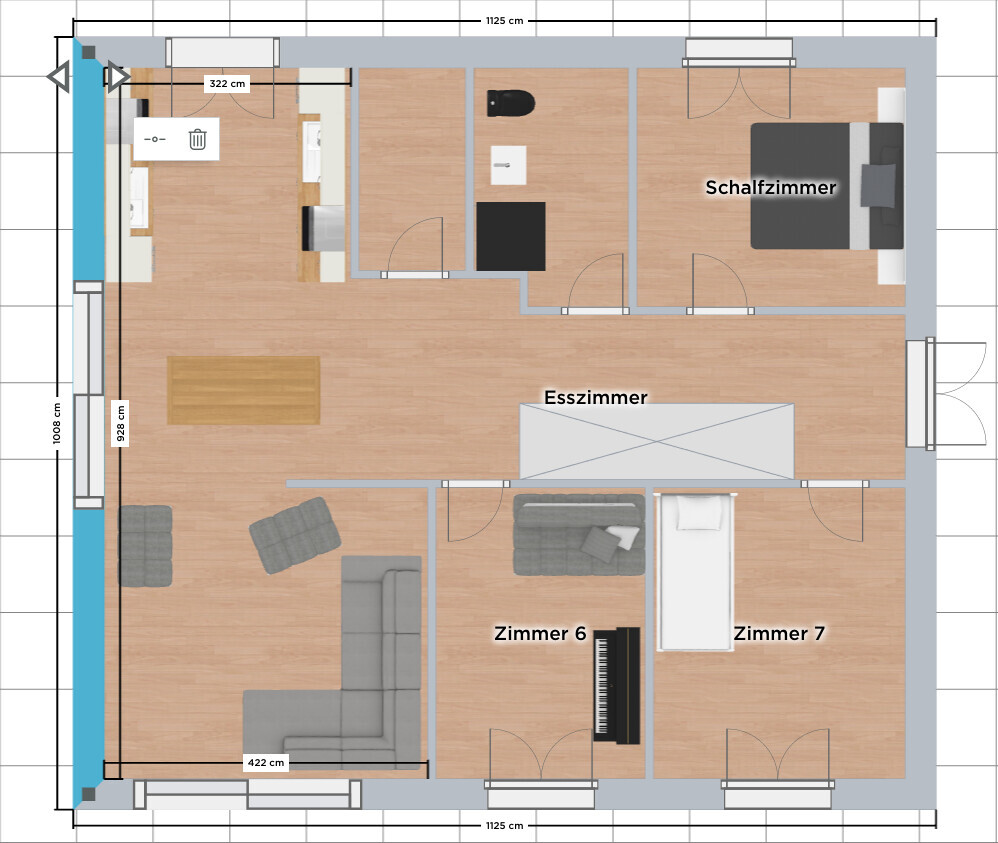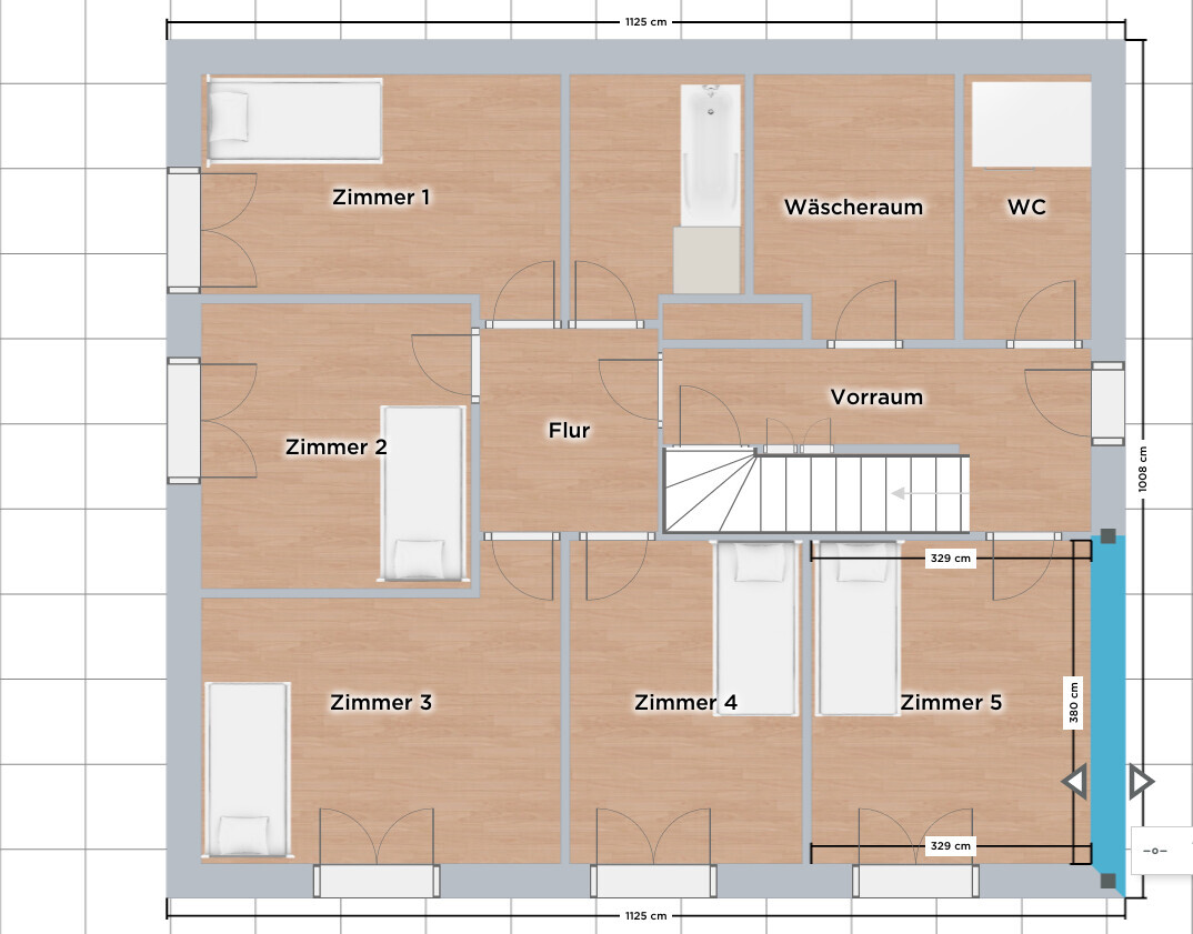 Eigentlich wollte ich Zimmer 5 als das grösste darstellen, damit es als Praxis? oder so mit dem Gäste-WC autark ist. Der hintere Flurbereich wäre später mal abzuteilen.