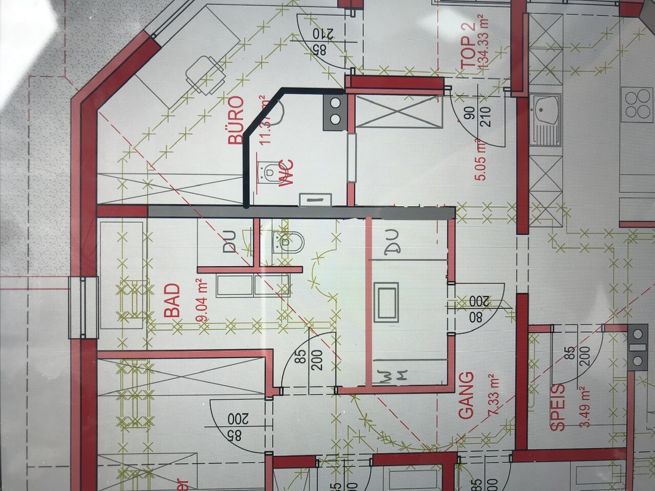 habe nun ein wenig versucht den Plan selbst zeichnerisch zu ändern. Was hältst du davon? Garderobe finde ich würde dann auch nicht verloren gehen.