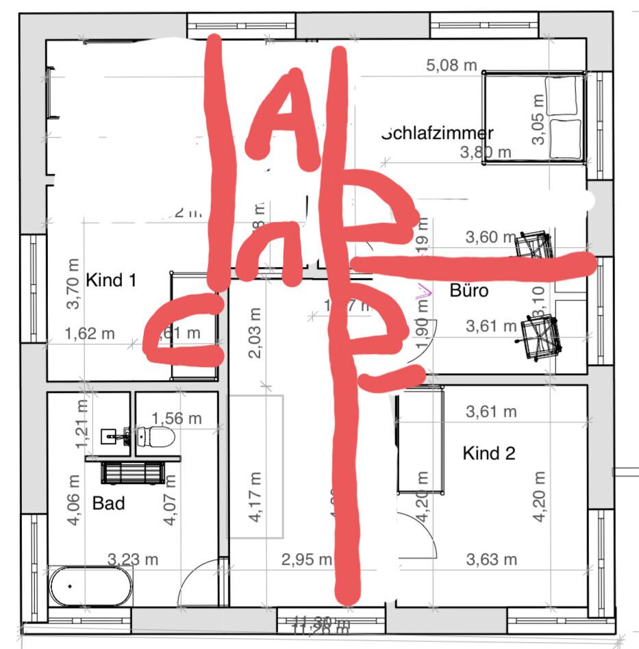 Oben haben Kinderzimmer und Schlafzimmer verschwendete Eingangsfläche, das kommt von schlechter Planung und muss neu, wenn es vernünftig soll. Kinderzimmer ist dadurch auch recht klein. 10qm zur Nutzung.