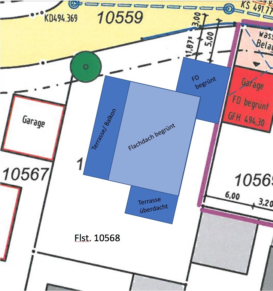 Lageplan eines Baugrundstücks mit Terrasse, Balkon, Flachdach und Garage.