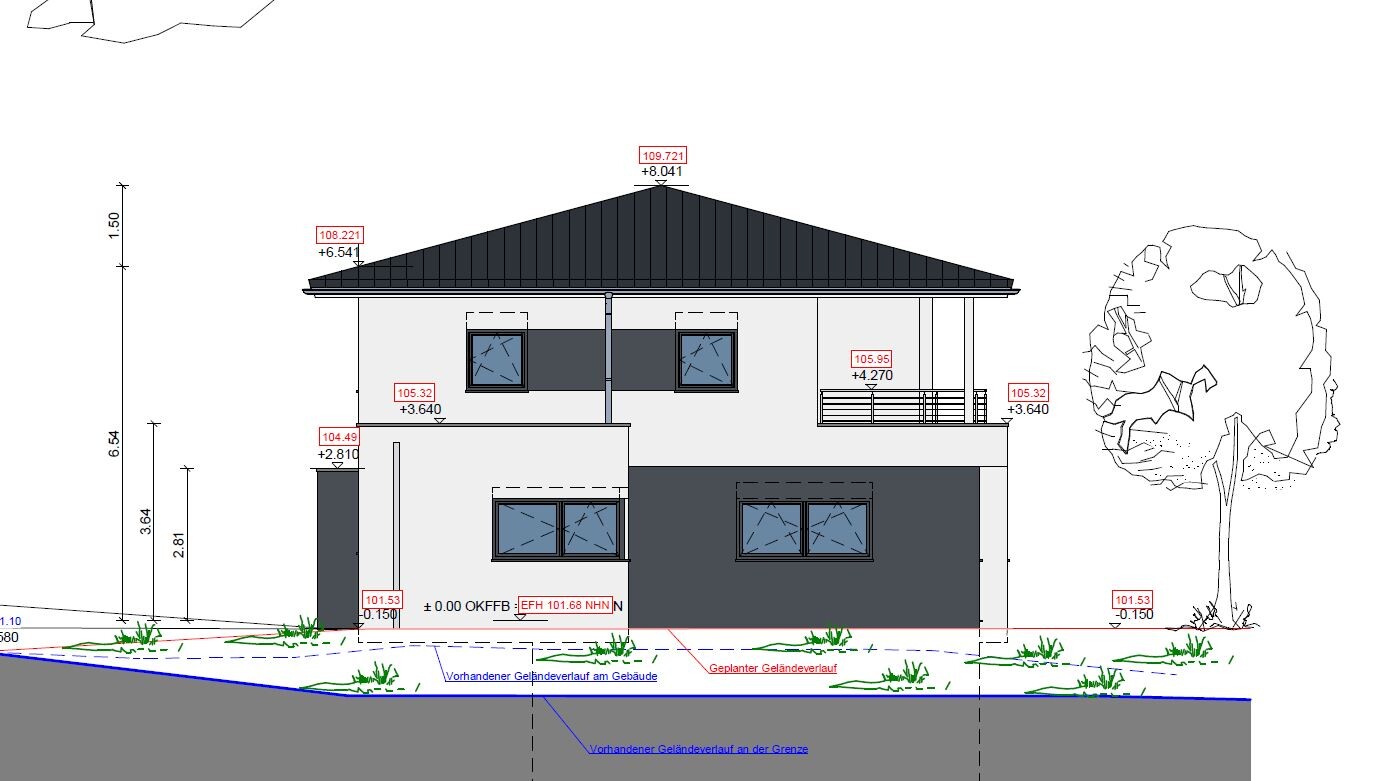 Ich will es ja nicht nach (plan)links verschieben, sondern das Mauerstück zwischen Kind-2- und Bad-Fenster von 24 auf 49 verbreitern und beide Fenster von 113.5 auf 101 verschmälern, dann bleiben die "Außenkanten" dieses Fensterzwillings gleich und das "kleine" Fenster bei Kind 2 muß nicht ohne Maueranschlag leben.Stimmt, das hatte ich nicht mehr auf dem Schirm. Aber sind unterschiedlich große Fenster an der Front nicht zu unruhig für das Bild? Sie zu verschieben, finde ich noch Ok aber die zwei rechten Fenster kleiner als die zwei linken?