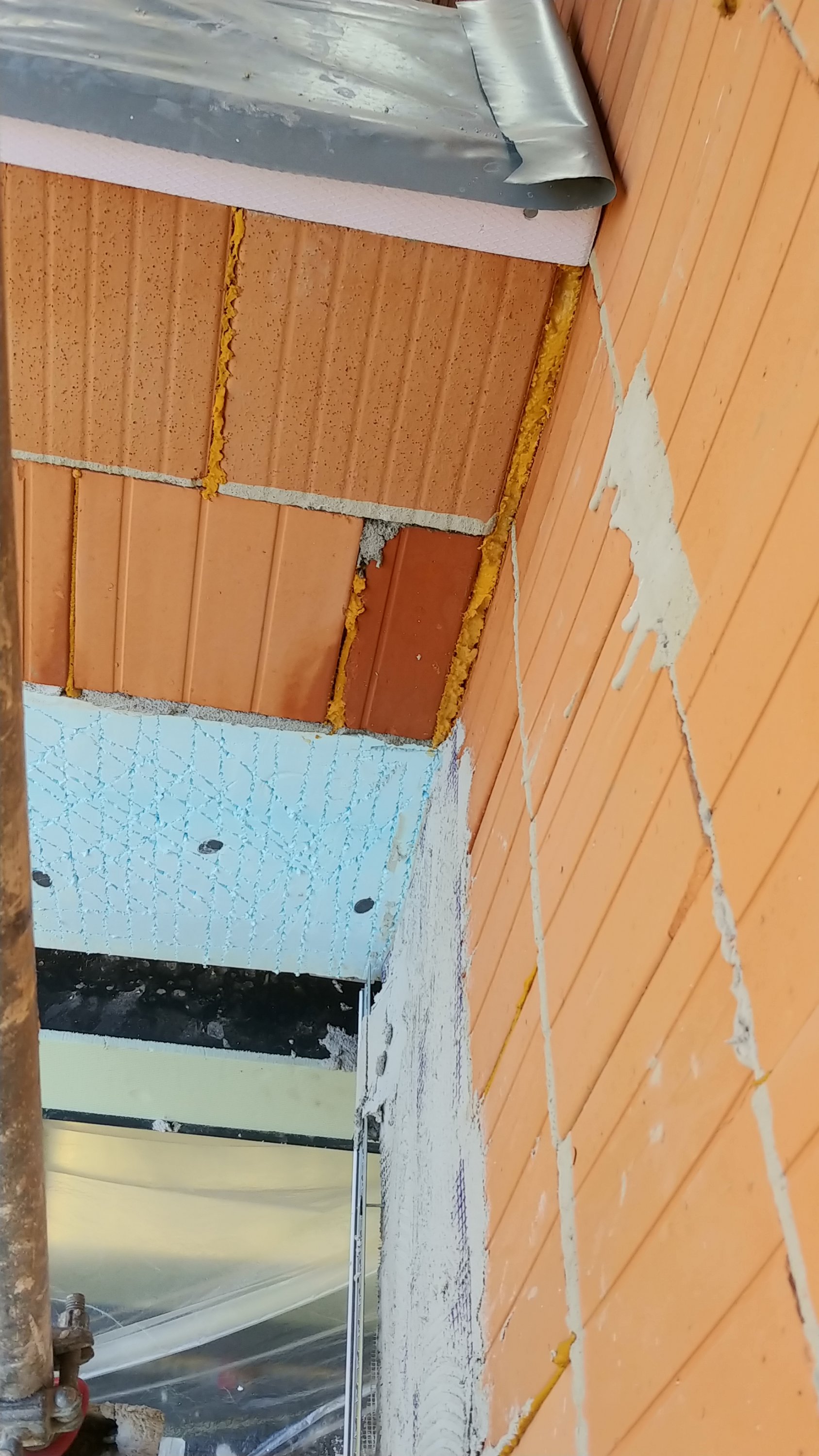 b) Es sind lediglich drei Halox Dosen nass und zwar die drei in der Küche, worüber das Flachdach des Küchenerkers liegt. War auf dem Gerüst und habe mal von außen ein paar Fotos davon gemacht. Die dunkleren Poroton Ziegel würde ich mal vermuten, sind durchnässt? Ebenfalls sieht man an der linken Wand eine Stelle im Poroton, die nicht sehr Vertrauen erweckend aussieht.