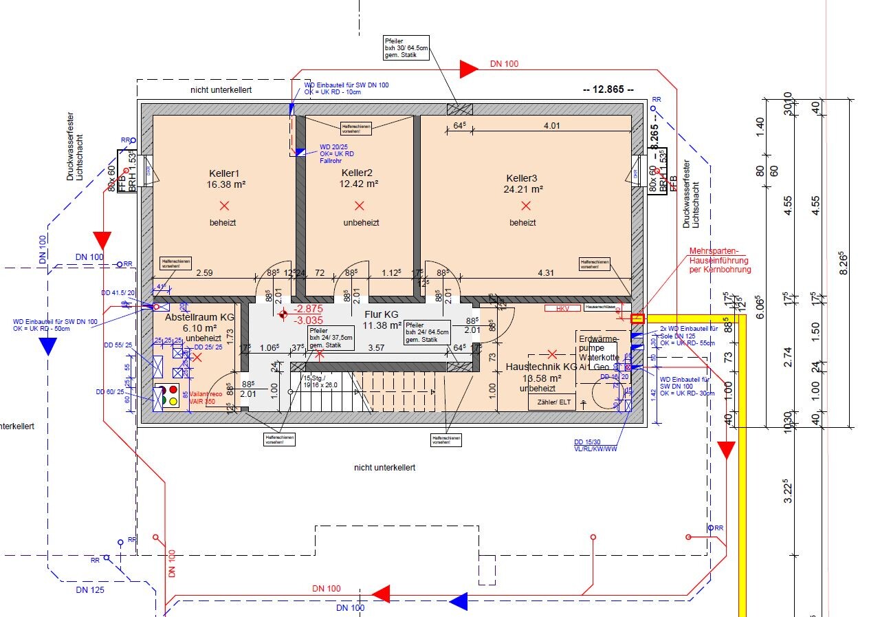Im Keller ist noch die Geo WP abgebildet. Wahrscheinlich wird es dann eine Gasheizung. Dahin gehend rot umrandet die Stelle zur Führung der Abgase einer Gasheizung sowie der Soleleitung der solaranlage.