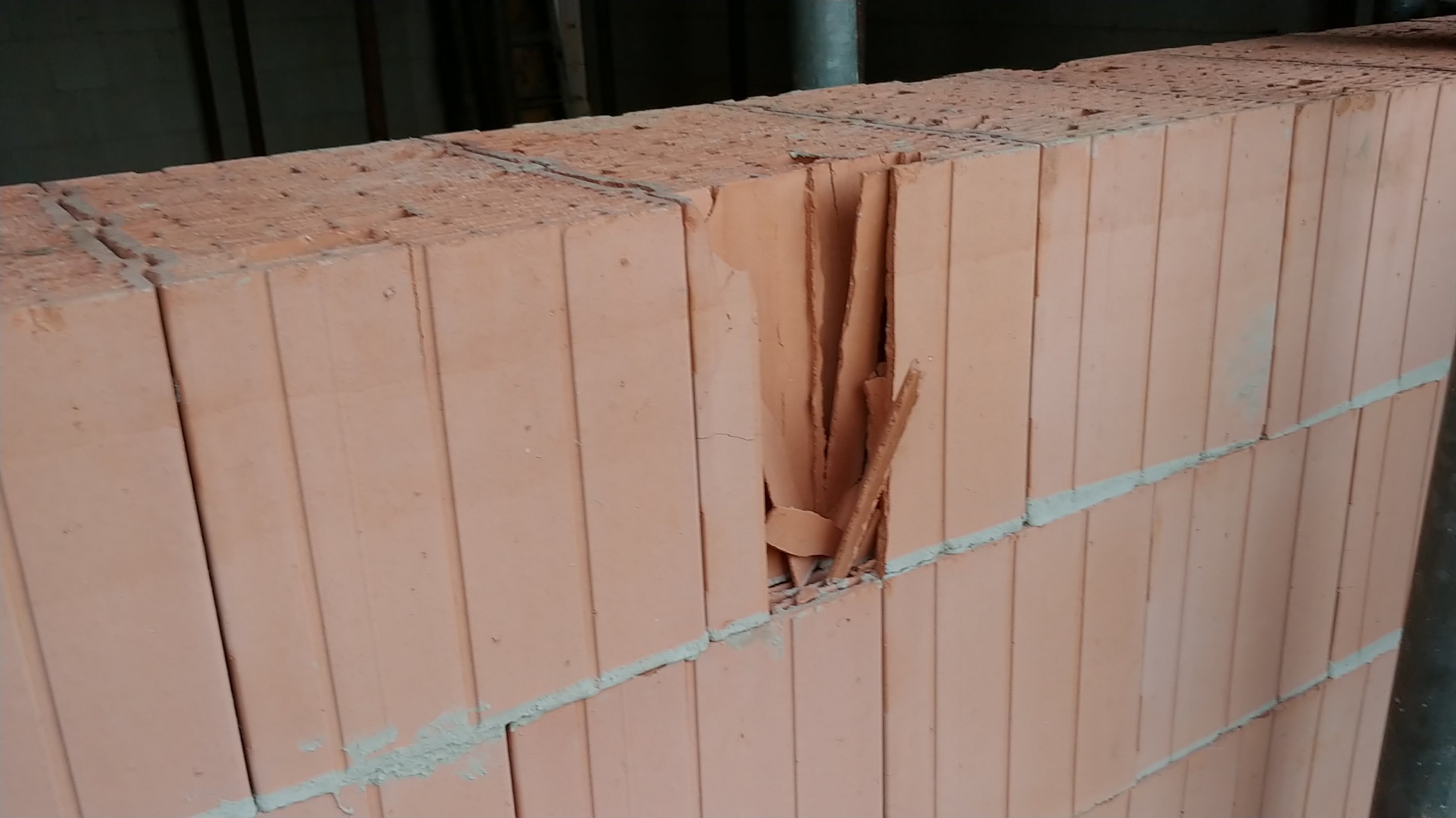 Wie sind derartige Beschädigungen im Poroton zu sehen? Beim ersten Bild ist der Kran rein gekracht. Der Bauleiter schreibt, das sei nichts Dramatisches aber er wolle die Demontage der Verschalung abwarten.