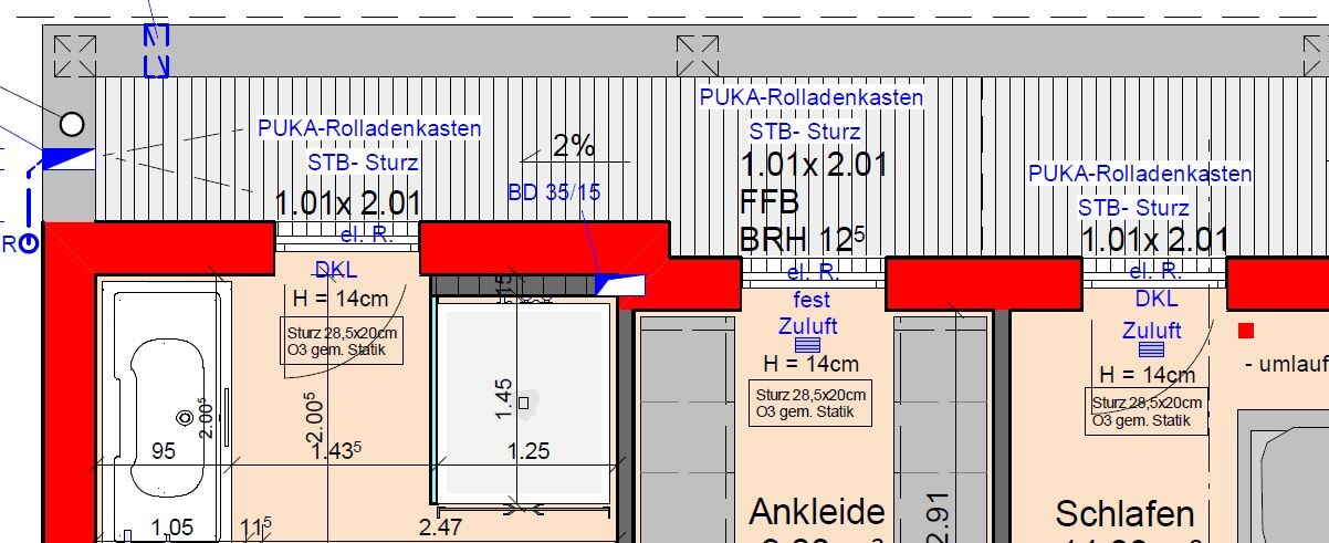 Ist das ein Ausschnitt ausm Werkplan? Ich frage deshalb, weil da ziemlich viel Farbe mit gefüllten Schraffuren vorhanden ist. Ich kenne das so nicht wirklich.