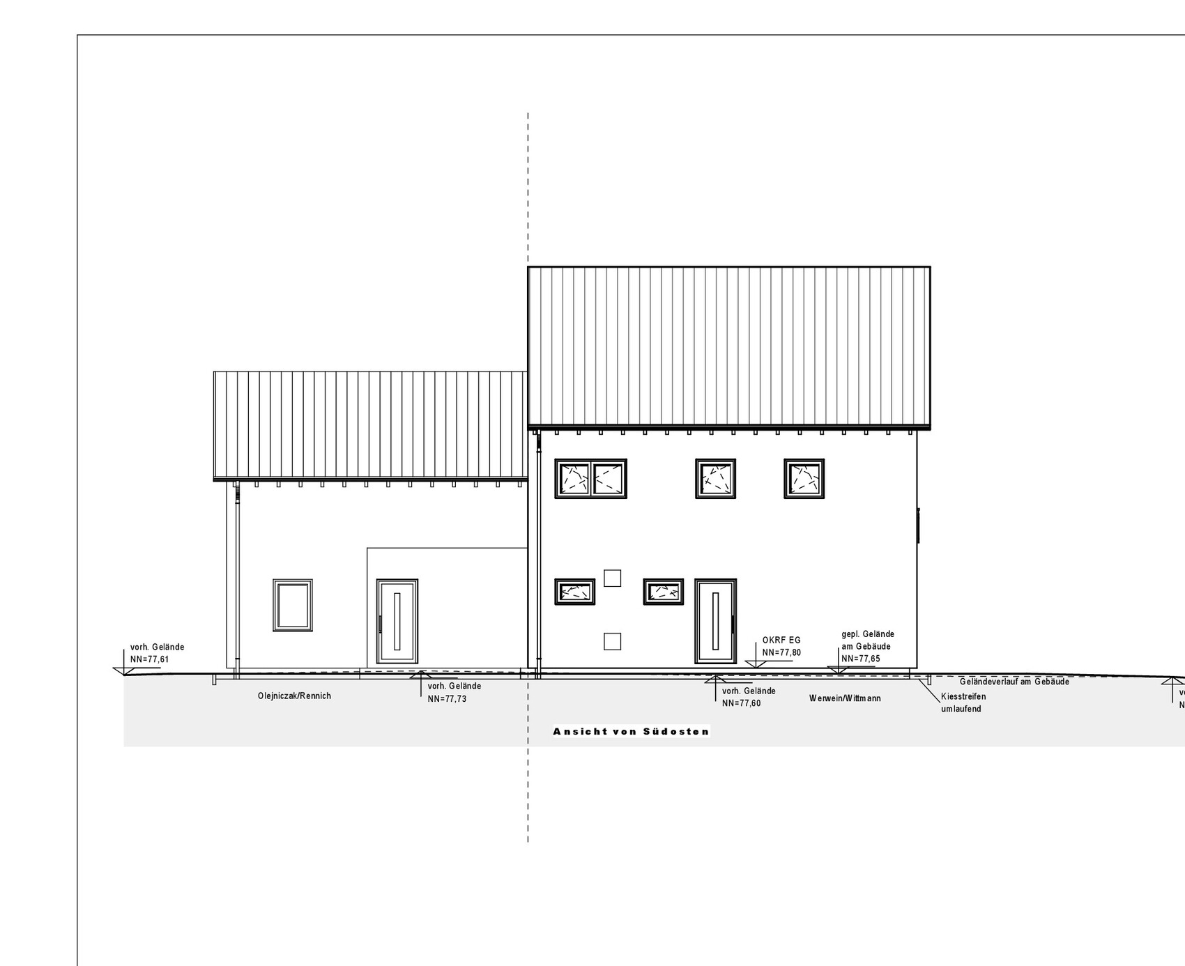 Südostansicht eines zweigeteilten Hauses mit zwei geneigten Dächern, Fenstern und Türen.
