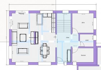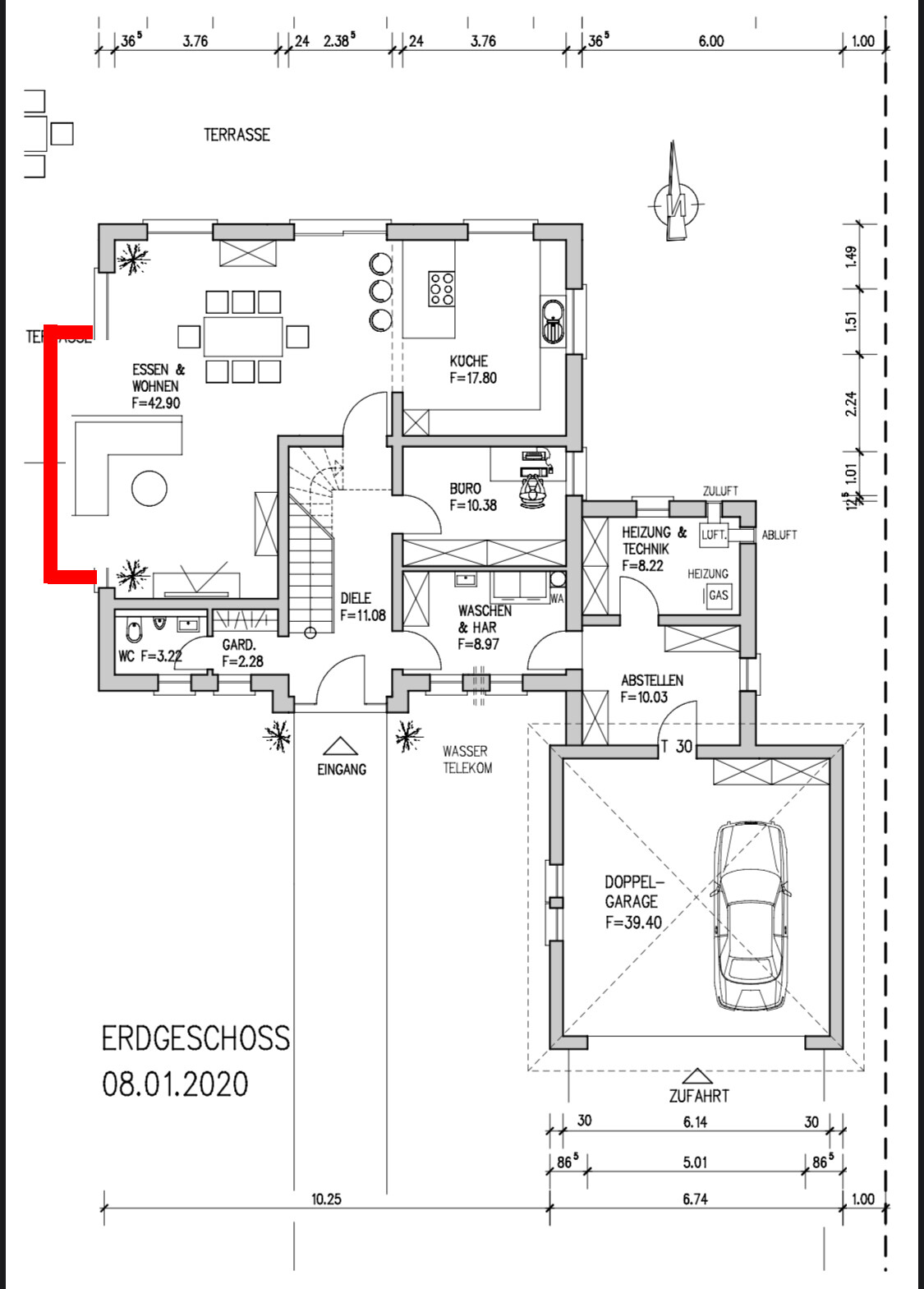 Dies hat zur Folge, dass in diesem Entwurf Wohnzimmer zu klein bzw. Küche zu groß geworden ist. Natürlich wäre ein Tausch beider Räume möglich, was jedoch wieder Nachteile hinsichtlich der Belichtung im WZ zur Folge hätte