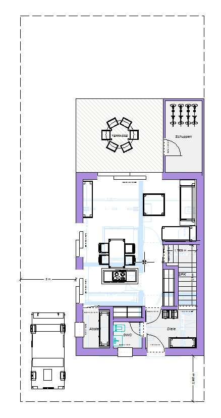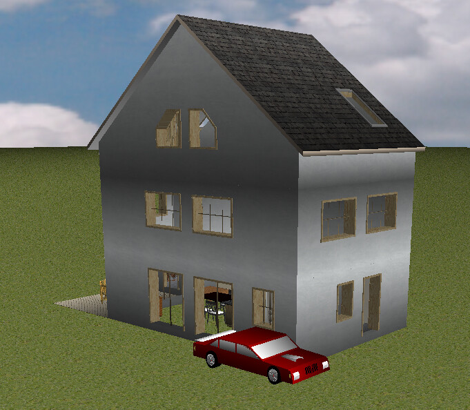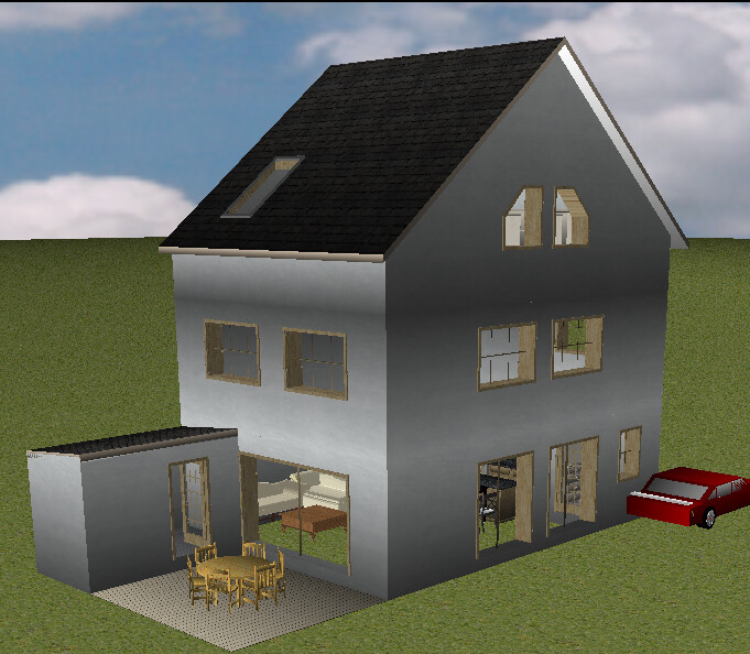 Wär es meins, würde ich die Eltis auch ins Dach planen, wie hampshire es hatte. Die Gaube würde ich mir sparen und für das Geld lieber ein Duschbad im Dach hinzufügen. Treppe vom Flur funktioniert auch im Reihenhaus - so kommt Ruhe ins OG. Fahrradschuppen im Garten würde ich aus Holz anbauen - gibt der Terrasse mehr Gemütlichkeit (nicht darstellbar).