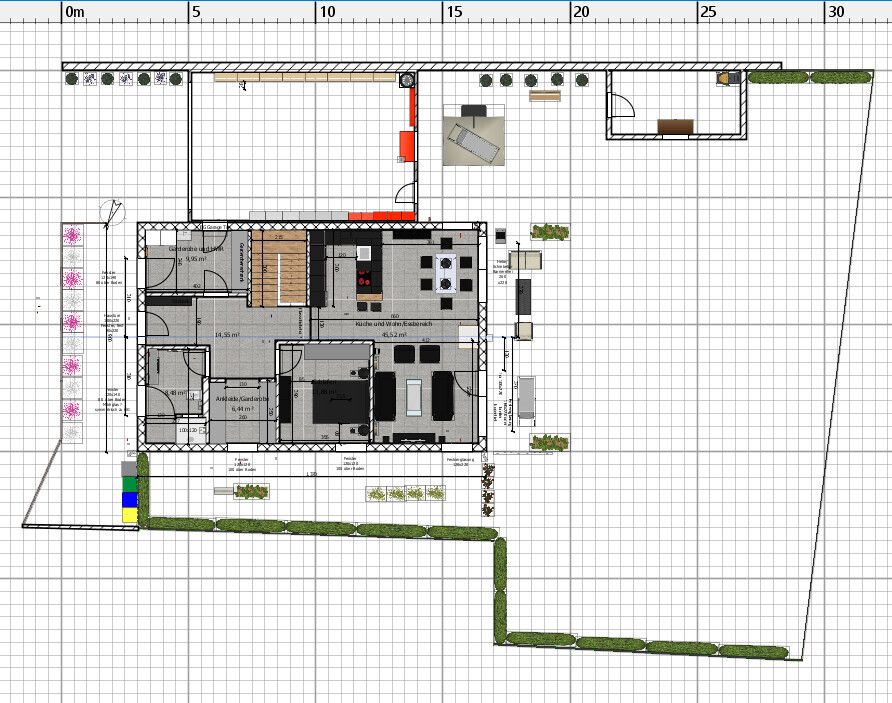 Dann muss ich auch sagen, dass ich mit den ganzen Limitierungen bzw Wünschen, warum wieso weshalb das Haus jetzt nicht einen Meter länger gebaut wird, schon durcheinander komme. Es gibt keine Skizze, die mal eine gedachte „Baulinie“ oder „Baugrenze„ darstellt. Denn wenn Du drei Meter von der Strasse das Haus bauen musst, die Garage aber 5 Meter, kannst Du doch sehr wohl den Eingang seitlich planen. Warum man unbedingt jetzt durch eine direkte Tür in die Garage kommen muss und den Weg über die Haustür scheut, habe ich noch nie verstanden.