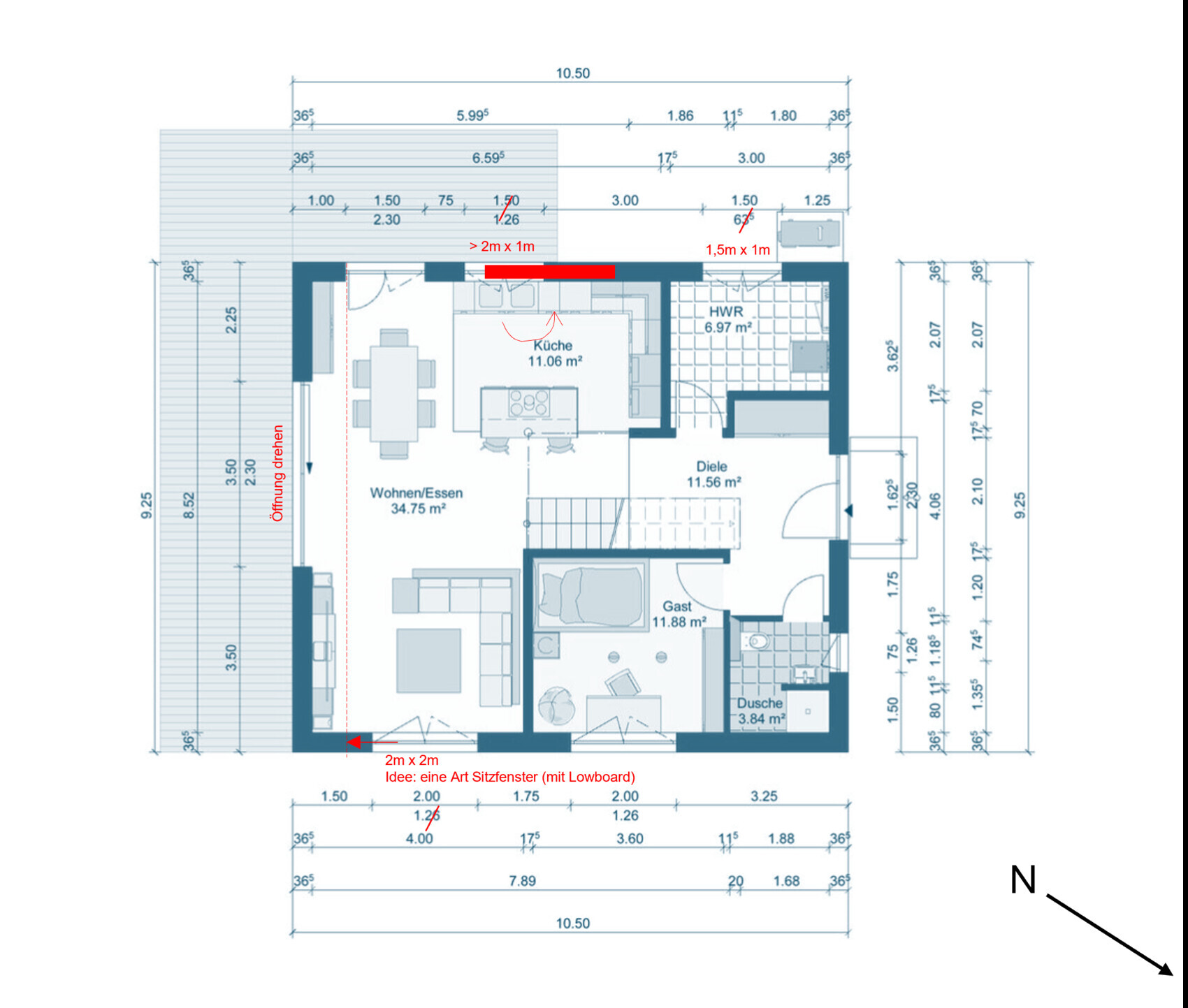 Mmh, ich muss da mal kurz ein wenig einhaken: der Entwurf ist die verkleinerte Version auf 10,70m x 9,40m - also weniger als der Vorherige mit 9,5 x 11 ist es auf jeden Fall. Der Chillbereich ist vom Sofa zur Wand 4,25m und 3m breit.
