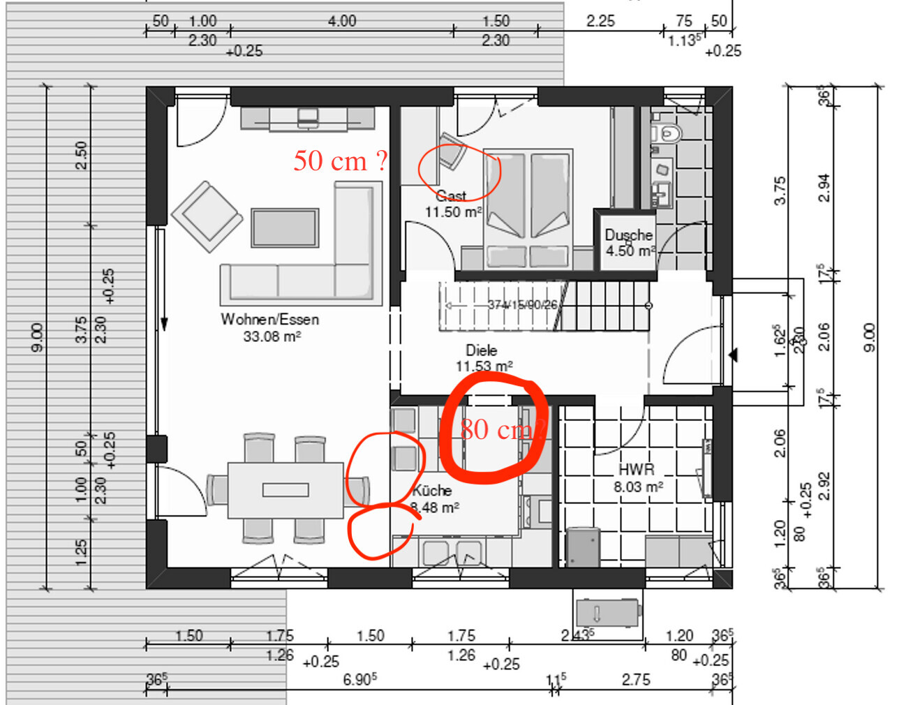 Ich würde an der Hausform nicht festhalten. 9 Meter Breite war schon vor 10 Jahren mit Außenwänden von 40cm eine Harausforderung, wenn man die gerade Treppe mit dem mittigen Flur haben wollte.