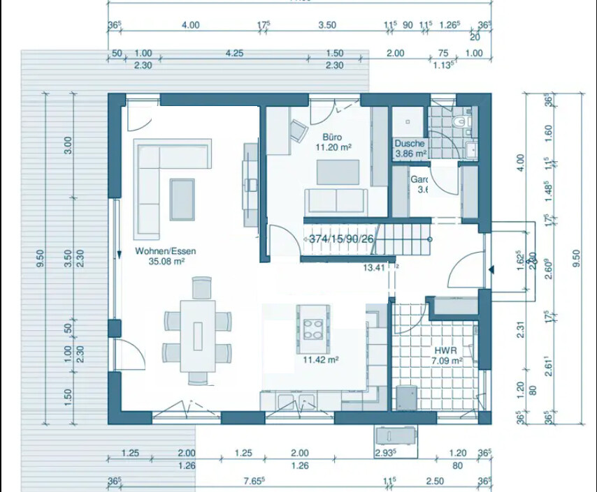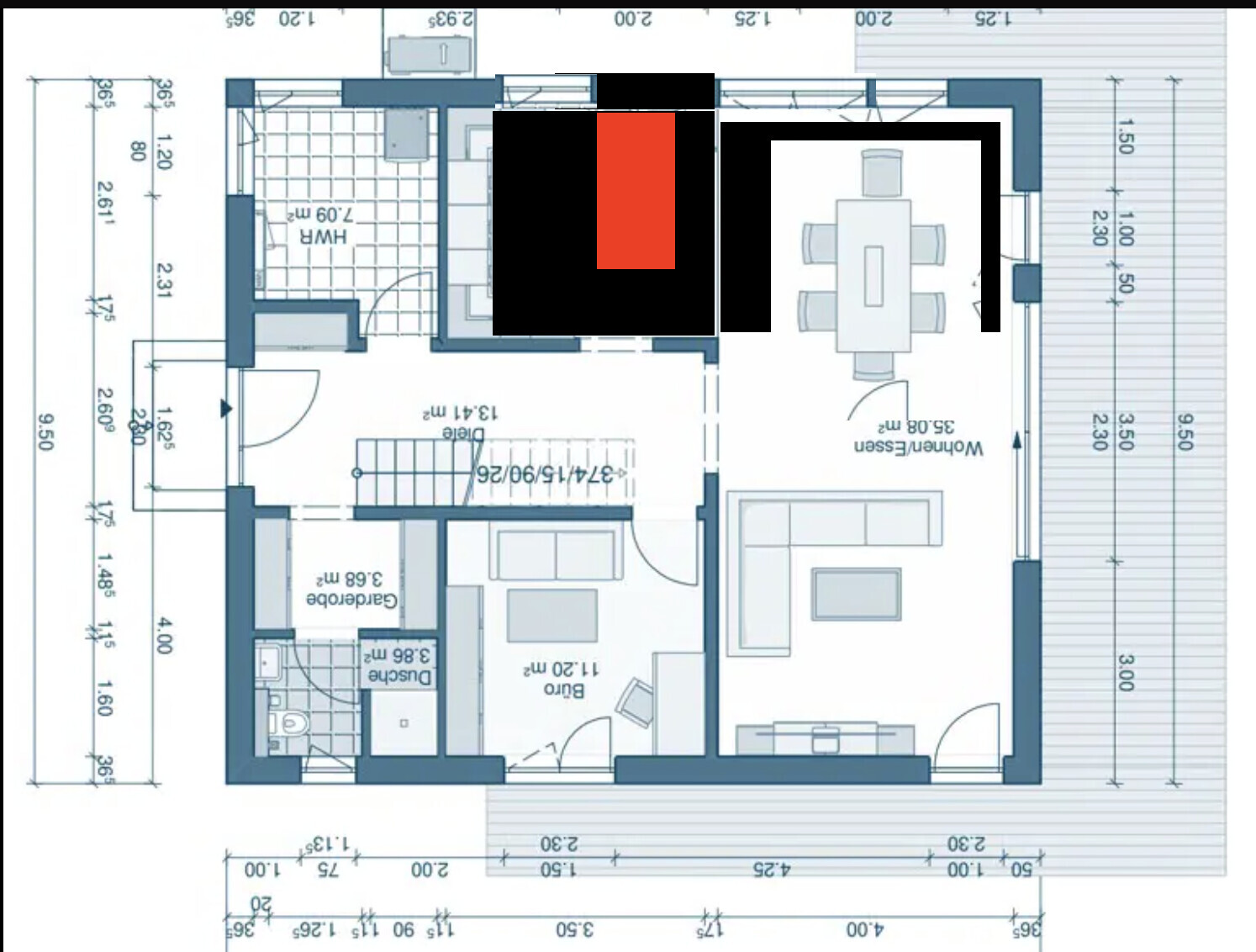 Eventuell würde ich die Tür zum Büro versetzen und selbiges etwas kleiner machen, um mehr Platz zum Wohnen zu haben und zusätzlich eine kleine Speis unter der Treppe: