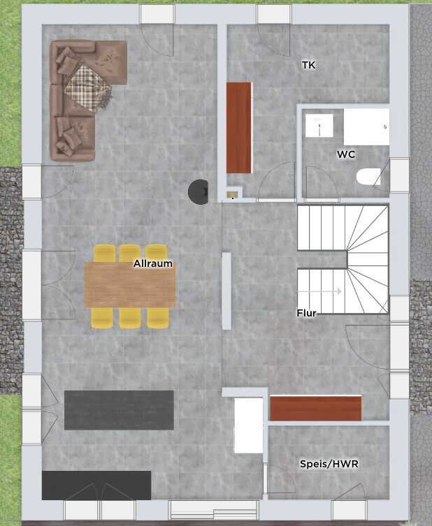 wir stellen uns irgendwie die Küche größer vor also die Zeile.Ja, leider ist auf der kurzen Hausseite mit Terrassentür nicht mehr drin.Da die Treppe nun mal auch irgendwie mittig oben rauskommen sollte, ist der Eingang auch irgendwie gesetzt… 🙁