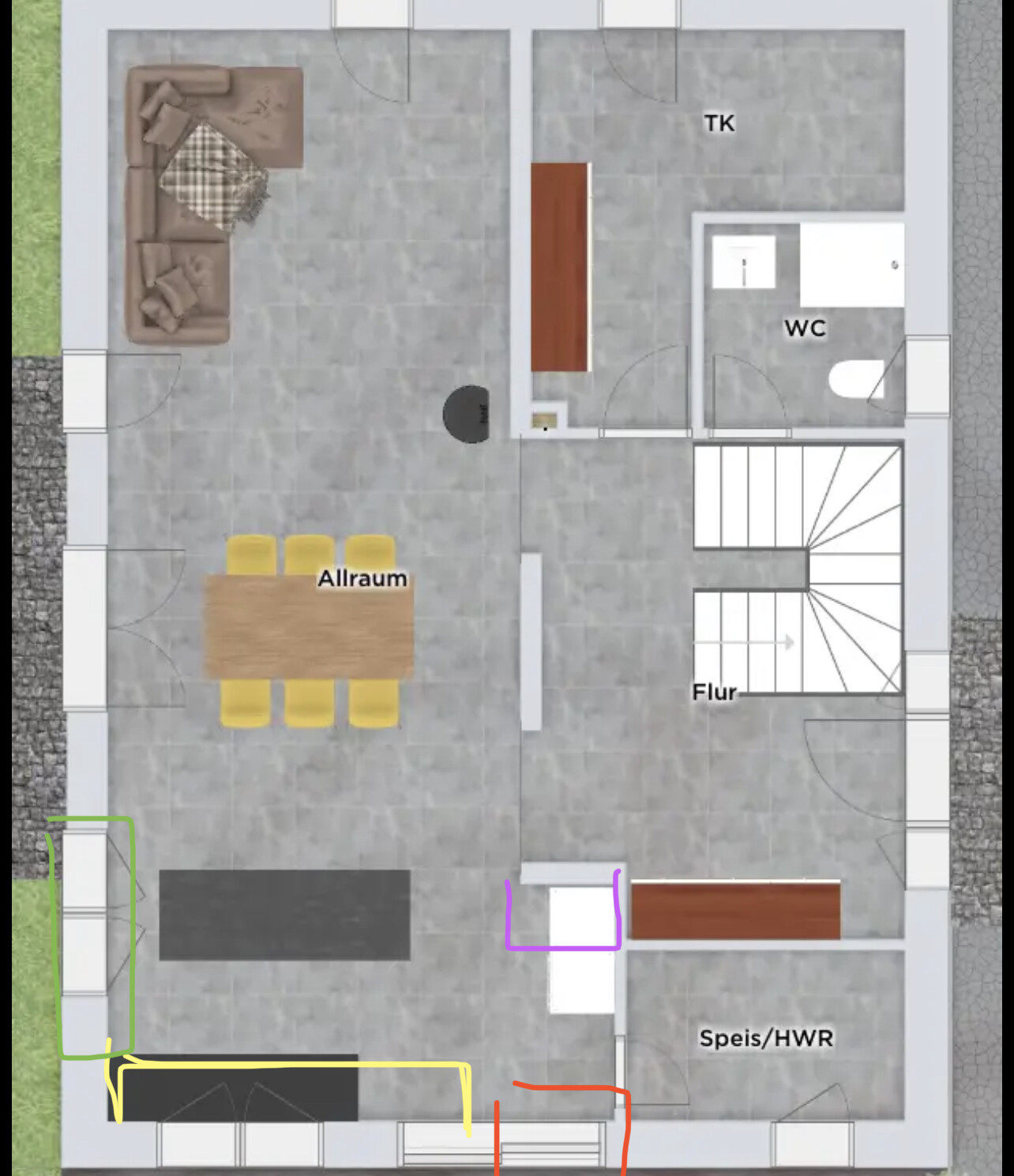 Terrasse dann ums Eck ziehen.Ja das wäre natürlich auch was! Wenn man den Kühlschrank aus der Küchenzeile raus nimmt könnte man ja auch vllt. mit 3,2-3,5 m Küchenzeile auskommen… dann könnte oben ja die Schiebetür und unten eine kleine Terrassentür einplanen?!Oder die Garderobe und Speise etwas verkleinern?