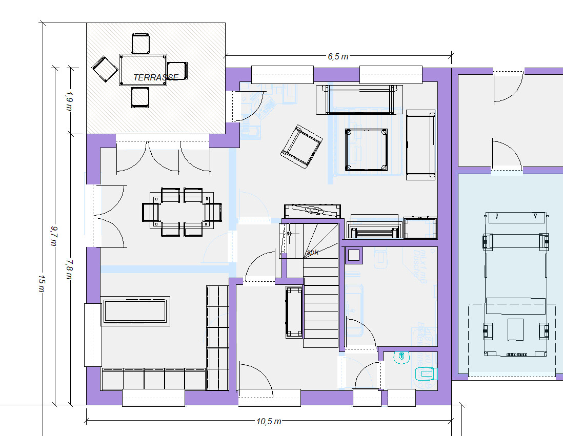 Verlassen wir mal das Rechteck und schauen, was es noch so gibt.Es gibt noch die 9,15er Breite, Länge ergibt sich bei ca. 77qm im EG.Machen wir uns nichts vor: es ist ein 144qm Haus.