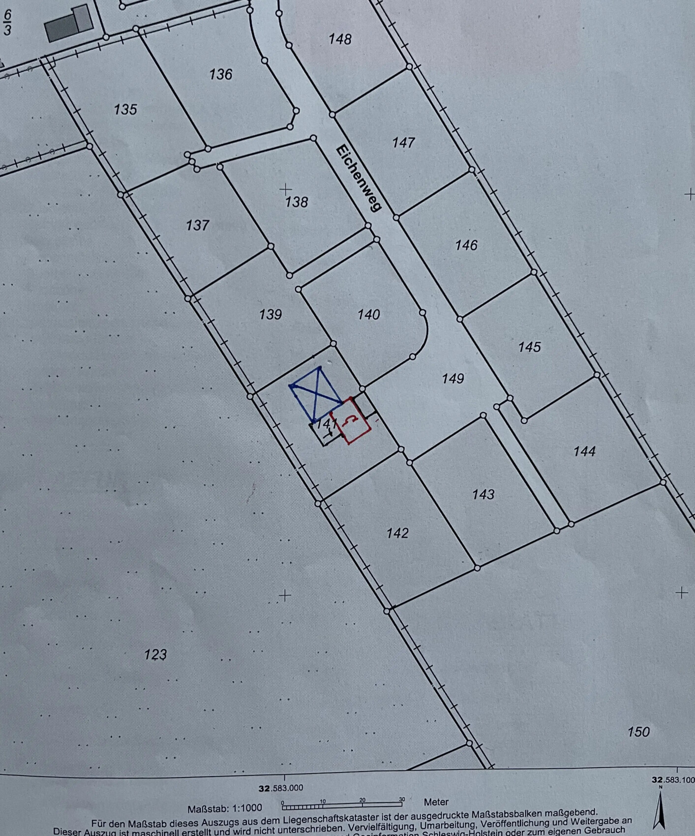 Grundstücksplan mit Parzellen, Flächenangaben (ca. 654 m²) und blau markiertem Gebäude.