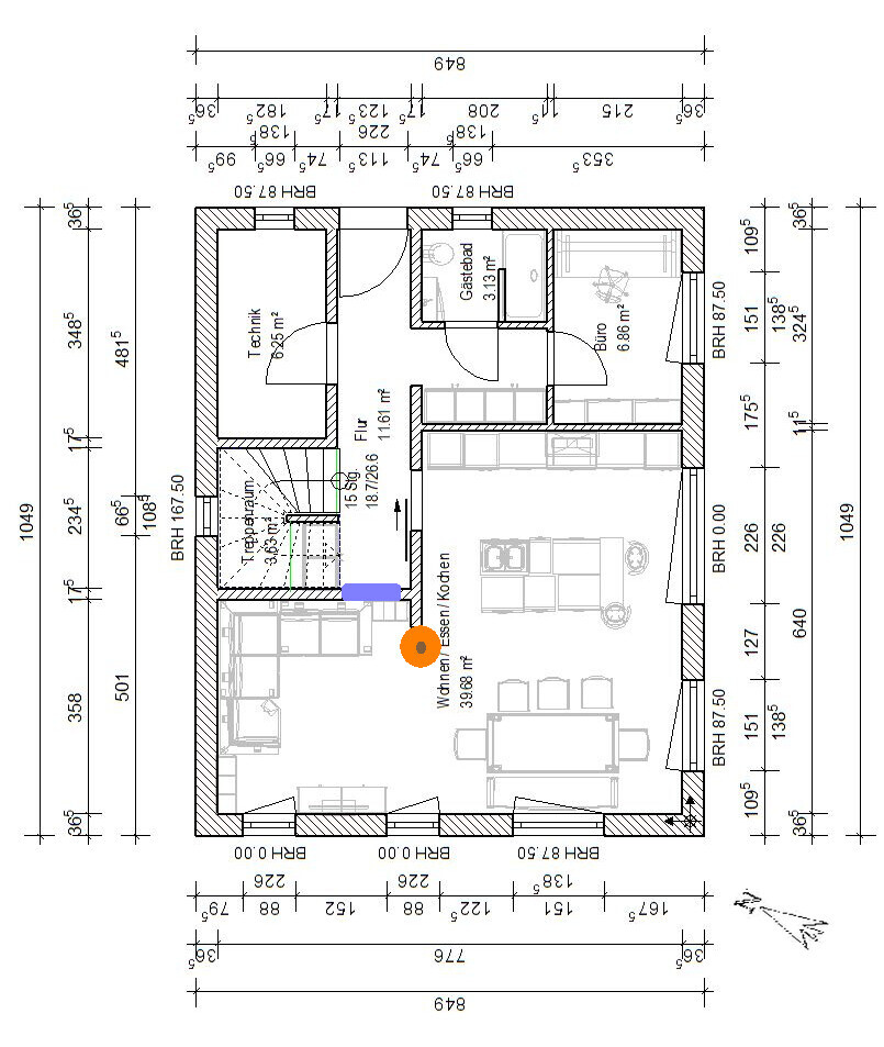 Die Grundrisse dazu (ich habe da mal den Nordpfeil angepasst) und im EG durch den Orangen Kreis noch einen Ofen symbolisiert, der müsste sich auch im OG ausgehen. Außerdem für mehr Licht im Flur noch in blau ein "Innenraumfenster" vom Wohnbereich Richtung Flur.