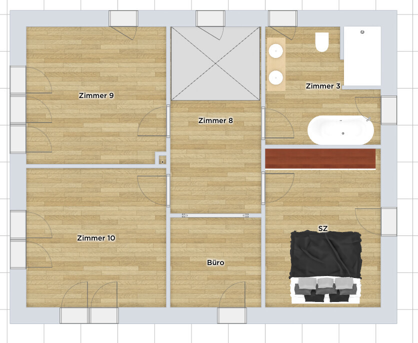 Die Reduktion der Flurfläche hast Du nun etwas zu scharf angezogen, aber Du scheinst wesentliche Grundlagen verstanden zu haben, vor allem: daß der beste Ort des Treppenaustrittes nahe der Mitte ist, hier strahlt der Verteilstern.