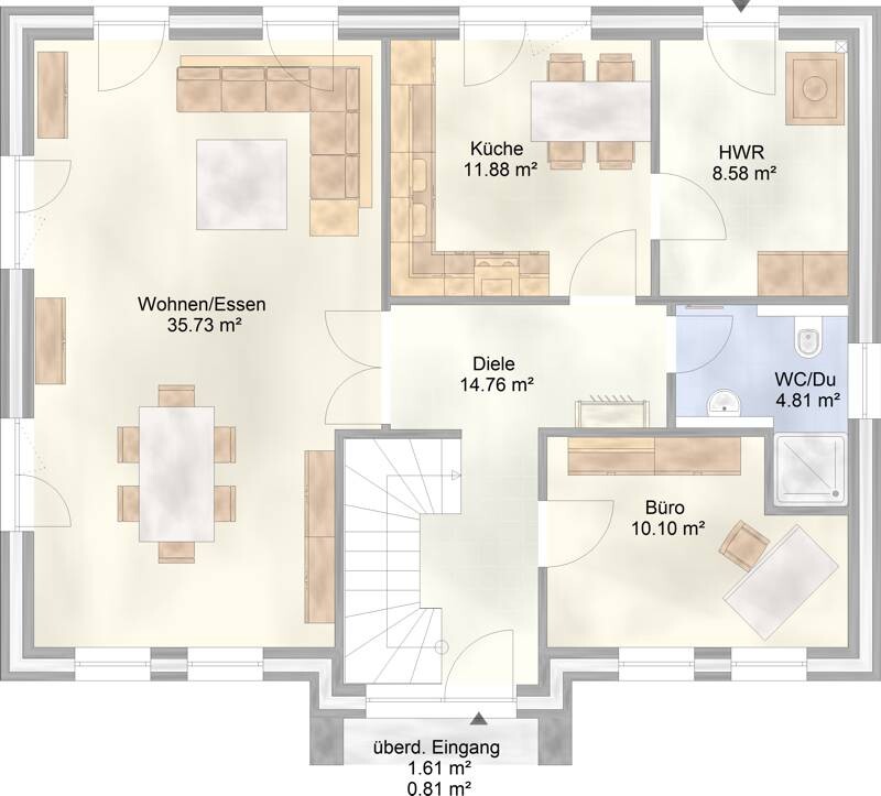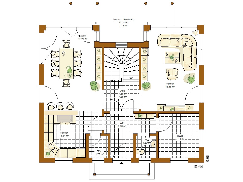 Gerade bei leichter Nordlage hat man hier einen hellen Küchen/Essbereich mit Anbindung an die nördliche Terrasse. Der Wohnbereich liegt zwar im Norden, das stellt aber meist kein Problem dar, da man sich hier entweder zu den Abendstunden oder zum Fernsehen aufhält.