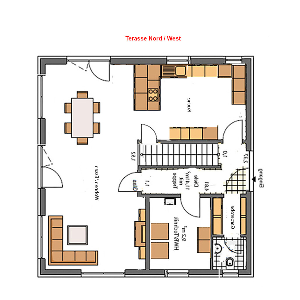 ... genau, wenn Terrasse in Nordwest, dann auch Küche/Essen dorthin. Denn gewöhnlicherweise bewegt man sich selten auf die Terrasse, wenn man gerade gemütlich auf dem Sofa sitzt sondern eher, wenn man mit Essen/Trinken zum Grillen/Genießen auf die Terrasse gehen will.
