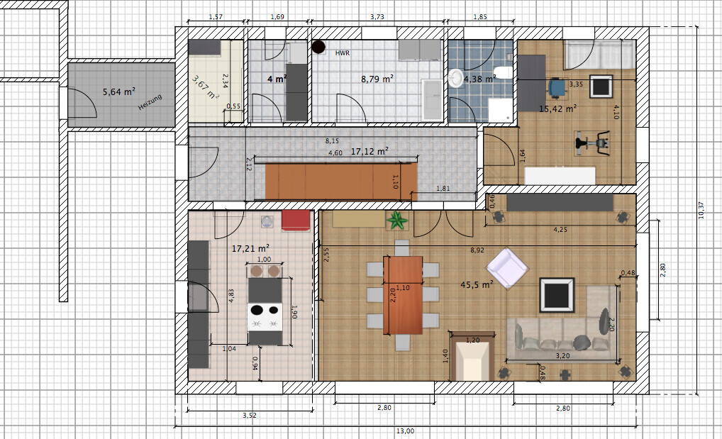 Was gefällt nicht: Lange Gänge, ich weiß nicht wie lange die Treppe sein muss bei einer Deckenhöhe von 2,65/2,75m, hab jetzt mal worst case 4,6m Länge angenommen.