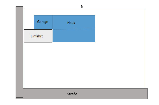 Die Garage ist zwar Richtung Süden ausgerichtet aber nur weil ich gegenüber noch einen Carport bauen möchte und dann eine Art Hof habe.Ggü.?? ... also planunten?Die Lage-Zeichnung ist nicht maßstabsgerecht ... denn Haus steht von planoben 5 m entfernt (du bezeichnest es als Baugrenze, ist doch aber Grundstücksgrenze - oder). Und Garage nur 1,5 m von der Straße weg? Ist das zulässig? Kann es sein, dass die Garage noch nicht sauber eingezeichnet ist? Die wäre dann nur 3 m von der Grundstücksgrenze planoben entfernt - oder?